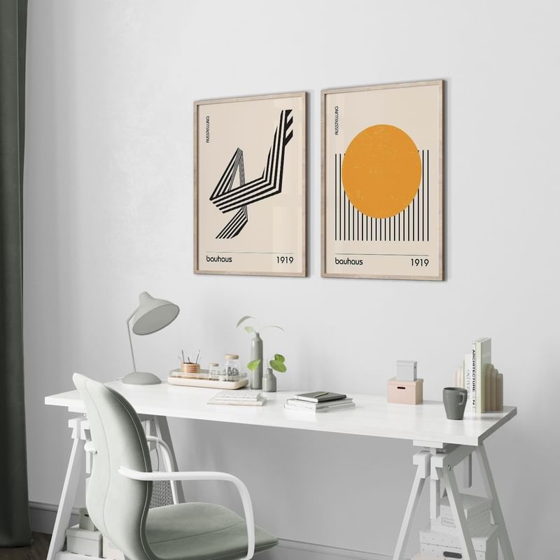 Inspirație pentru un perete cu tablouri în biroul de acasă. Pe această pagină, am adunat colajele noastre pentru biroul de acasă. Sortați după culoarea peretelui sau după numărul de postere și cumpărați întregul colaj sau alegeți posterele și ramele care vă plac cel mai mult.