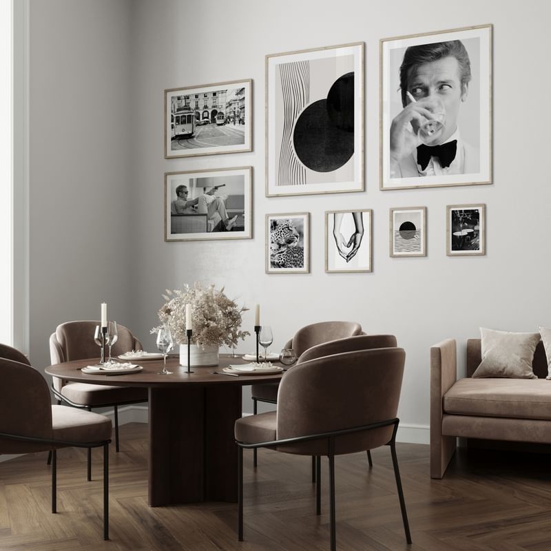 Inspirație pentru un perete cu tablouri în bucătărie. Pe această pagină, am adunat colajele noastre pentru bucătărie. Sortați după culoarea peretelui sau după numărul de postere și cumpărați întregul colaj sau alegeți posterele și ramele care vă plac cel mai mult.
