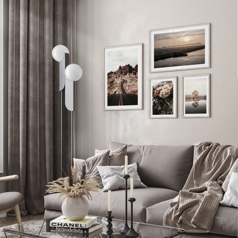 Inspirați-vă pentru un perete cu imagini în camera de zi. Pe această pagină, am adunat colajele noastre pentru sufragerie. Sortați după culoarea peretelui sau după numărul de postere și cumpărați întregul colaj sau alegeți posterele și ramele care vă plac cel mai mult.