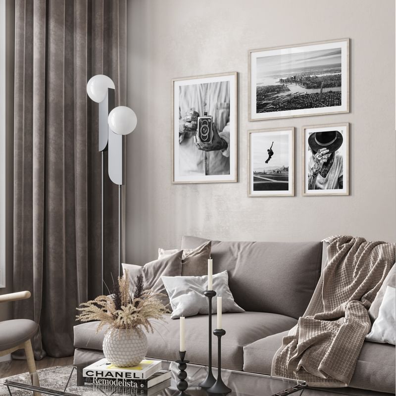 Inspirați-vă pentru un perete cu imagini în camera de zi. Pe această pagină, am adunat colajele noastre pentru sufragerie. Sortați după culoarea peretelui sau după numărul de postere și cumpărați întregul colaj sau alegeți posterele și ramele care vă plac cel mai mult.
