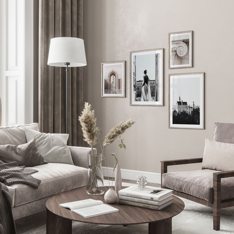 Inspirați-vă pentru un perete cu imagini în camera de zi. Pe această pagină, am adunat colajele noastre pentru sufragerie. Sortați după culoarea peretelui sau după numărul de postere și cumpărați întregul colaj sau alegeți posterele și ramele care vă plac cel mai mult.