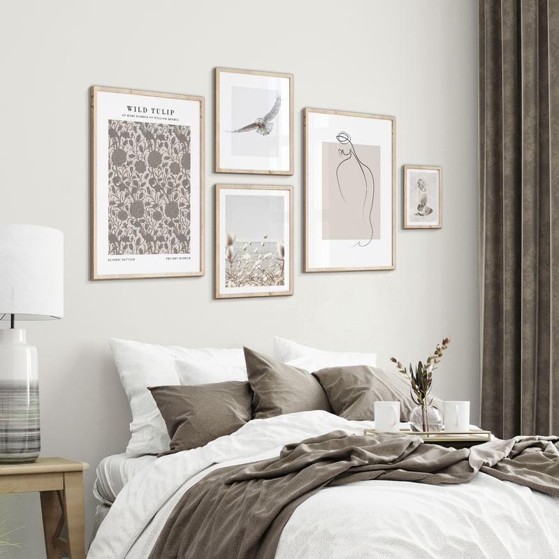 Inspirație pentru un perete cu tablouri în dormitor. Pe această pagină, am adunat colajele noastre de imagini pentru dormitor. Sortați după culoarea peretelui sau după numărul de postere și cumpărați întregul colaj sau alegeți posterele și ramele care vă plac cel mai mult.