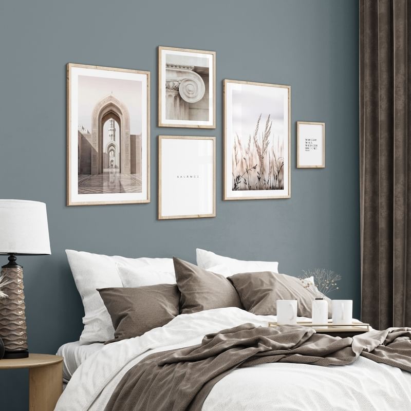 Inspirație pentru un perete cu tablouri în dormitor. Pe această pagină, am adunat colajele noastre de imagini pentru dormitor. Sortați după culoarea peretelui sau după numărul de postere și cumpărați întregul colaj sau alegeți posterele și ramele care vă plac cel mai mult.