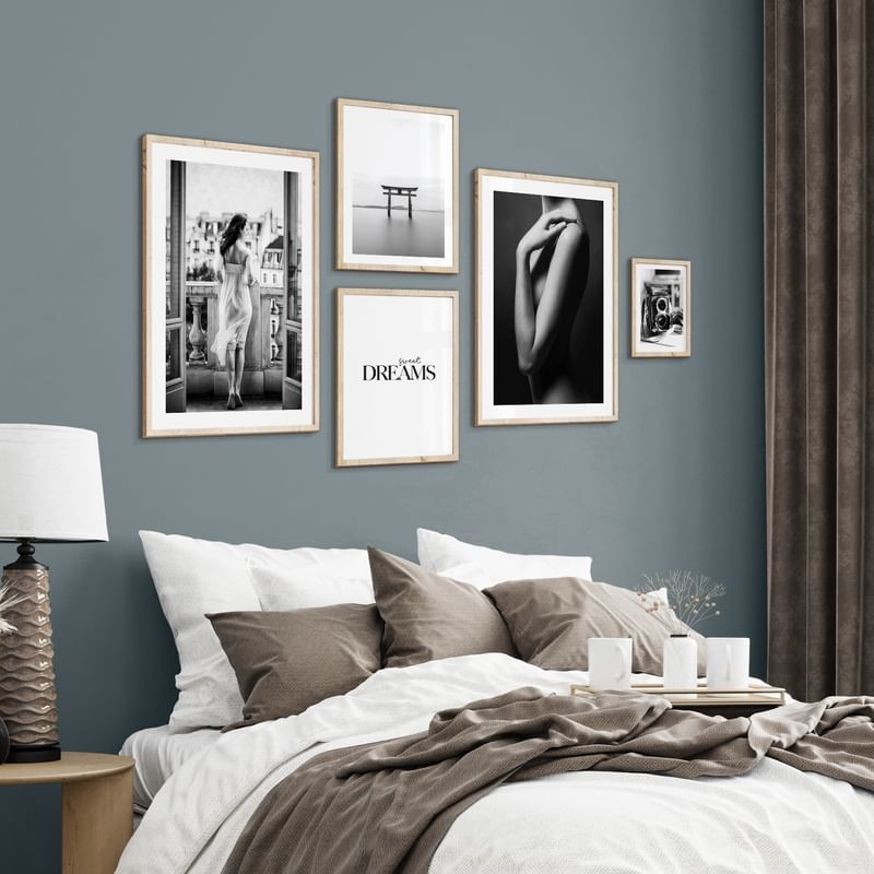Inspirație pentru un perete cu tablouri în dormitor. Pe această pagină, am adunat colajele noastre de imagini pentru dormitor. Sortați după culoarea peretelui sau după numărul de postere și cumpărați întregul colaj sau alegeți posterele și ramele care vă plac cel mai mult.