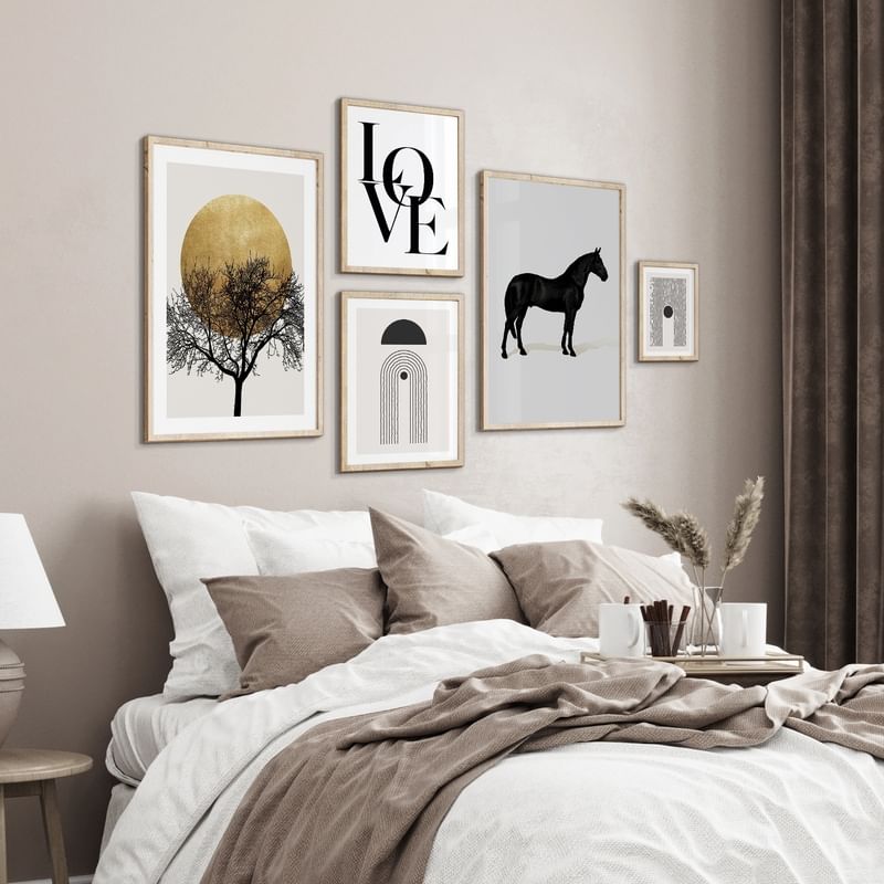 Inspirație pentru un perete cu tablouri în dormitor. Pe această pagină, am adunat colajele noastre de imagini pentru dormitor. Sortați după culoarea peretelui sau după numărul de postere și cumpărați întregul colaj sau alegeți posterele și ramele care vă plac cel mai mult.