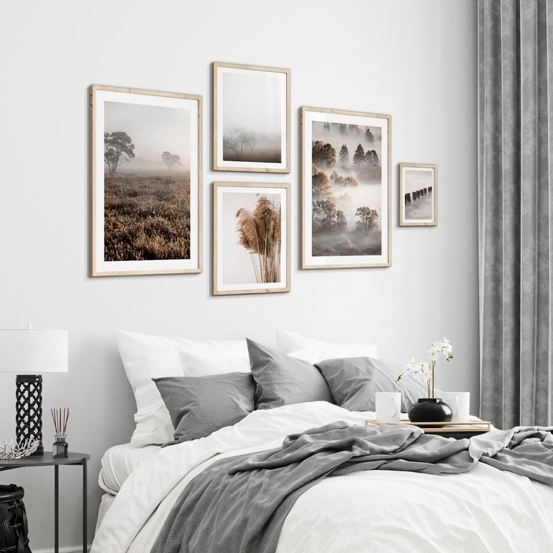 Inspirație pentru un perete cu tablouri în dormitor. Pe această pagină, am adunat colajele noastre de imagini pentru dormitor. Sortați după culoarea peretelui sau după numărul de postere și cumpărați întregul colaj sau alegeți posterele și ramele care vă plac cel mai mult.