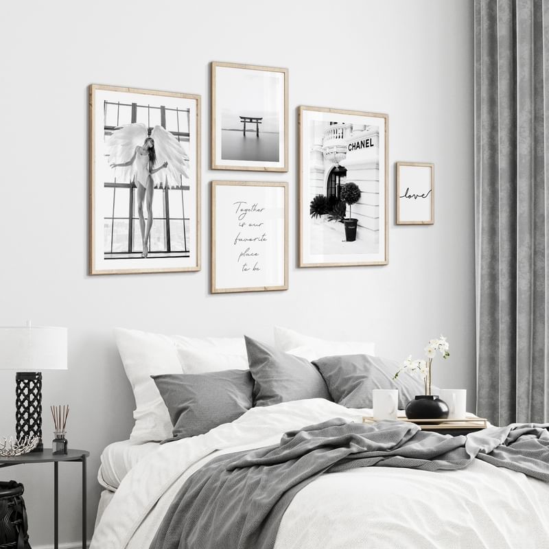Inspirație pentru un perete cu tablouri în dormitor. Pe această pagină, am adunat colajele noastre de imagini pentru dormitor. Sortați după culoarea peretelui sau după numărul de postere și cumpărați întregul colaj sau alegeți posterele și ramele care vă plac cel mai mult.