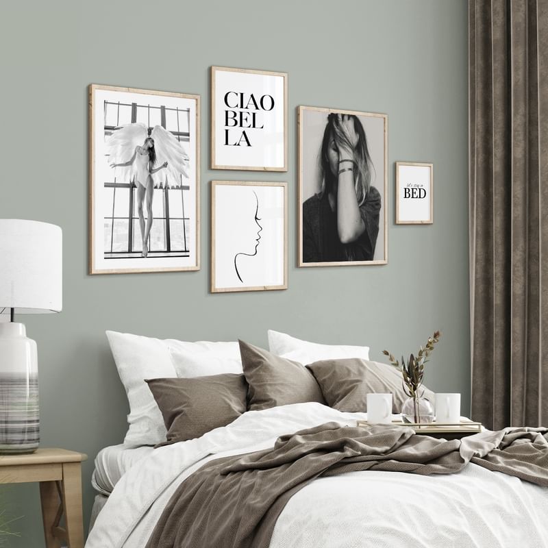 Inspirație pentru un perete cu tablouri în dormitor. Pe această pagină, am adunat colajele noastre de imagini pentru dormitor. Sortați după culoarea peretelui sau după numărul de postere și cumpărați întregul colaj sau alegeți posterele și ramele care vă plac cel mai mult.