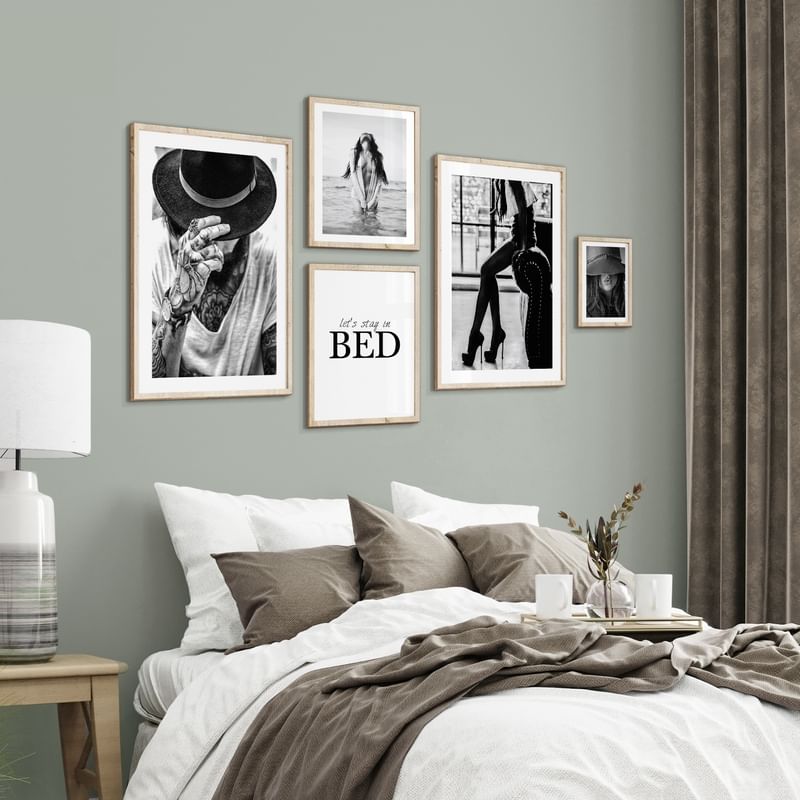 Inspirație pentru un perete cu tablouri în dormitor. Pe această pagină, am adunat colajele noastre de imagini pentru dormitor. Sortați după culoarea peretelui sau după numărul de postere și cumpărați întregul colaj sau alegeți posterele și ramele care vă plac cel mai mult.