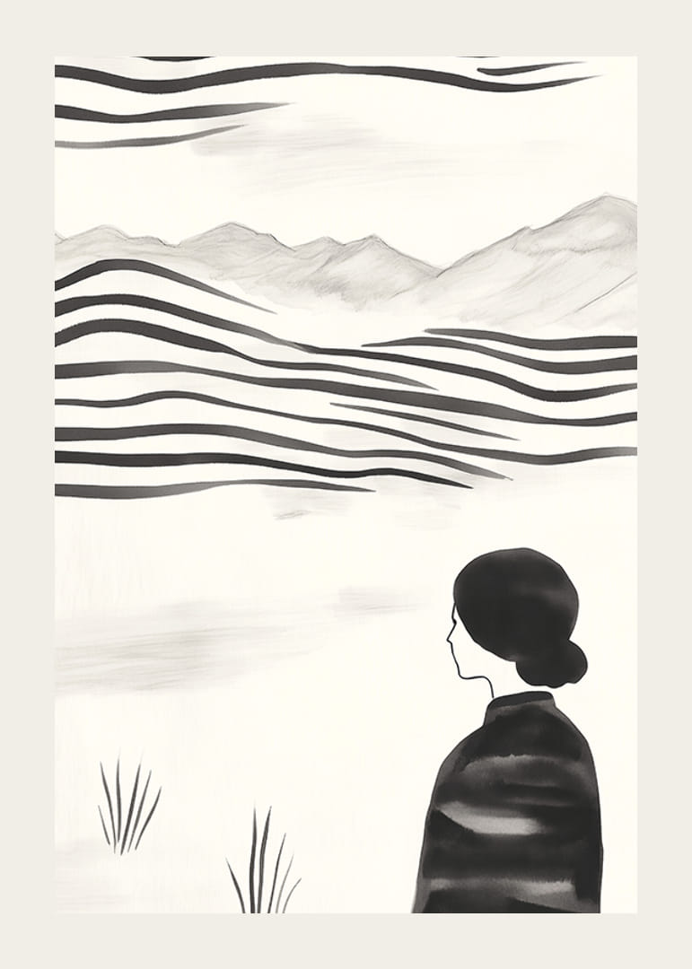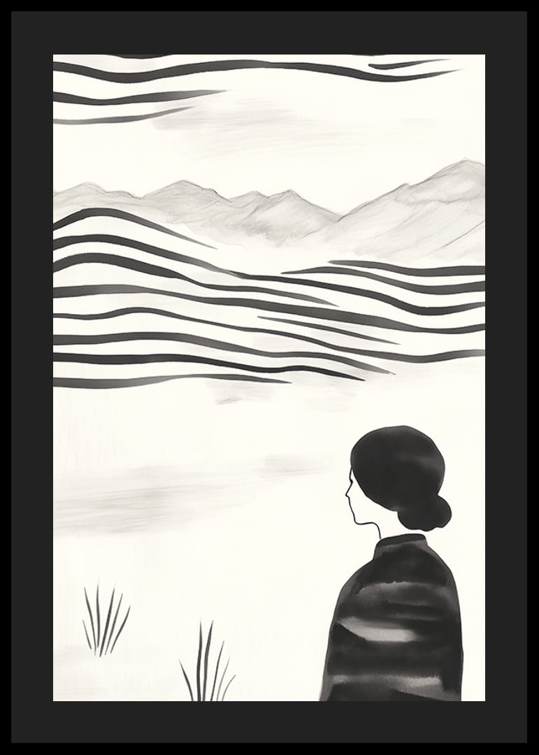 Acest poster surprinde un instantaneu al liniștii, în care o femeie stă în fața unui peisaj abstract, ondulat, în alb și negru. Liniile moi și tonurile atenuate dau o senzație de atemporalitate și liniște. Cu stilul său minimalist, evocă gânduri despre frumusețea și eternitatea naturii.