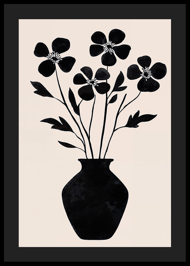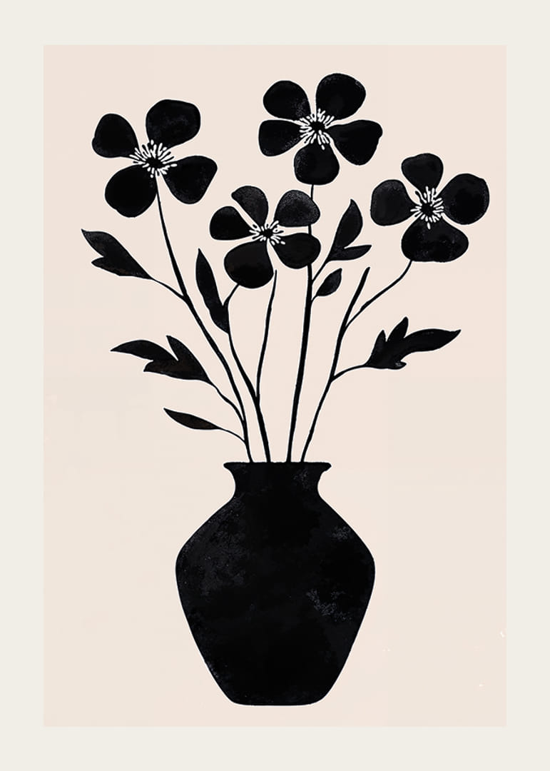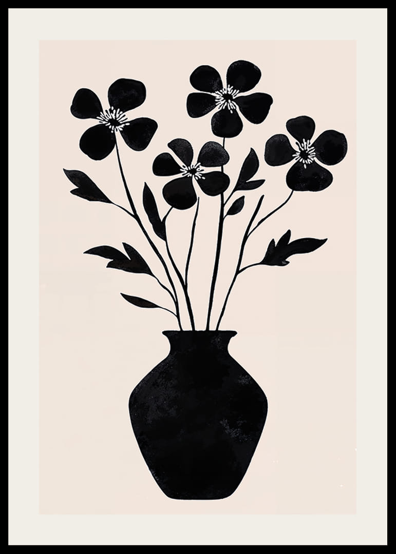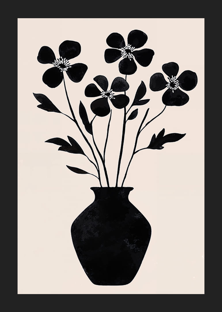 Acest poster surprinde simplitatea florilor cu silueta alb-negru într-o vază elegantă. Liniile curate și contrastele designului creează un sentiment de stil și armonie atemporale. Frumusetea siluetelor este evidentiata de fundalul deschis, creand o atmosfera linistitoare.