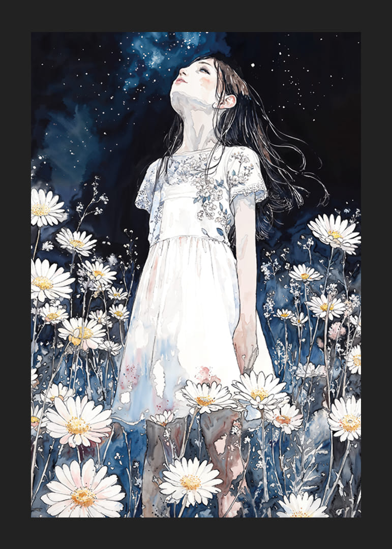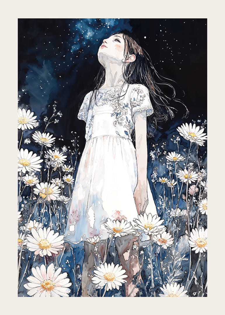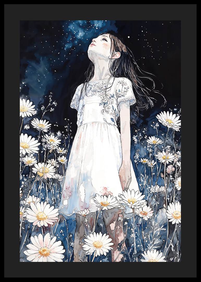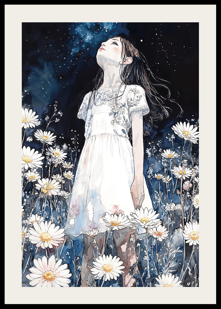 Ochii tăi sunt imediat atrași de acest afiș încântător în care o fată stă în mijlocul unei mări de margarete și privește în sus la cerul înstelat al nopții. Cu atmosfera sa de vis și tonurile de albastru profund ale nopții, posterul creează un sentiment de calm și libertate.