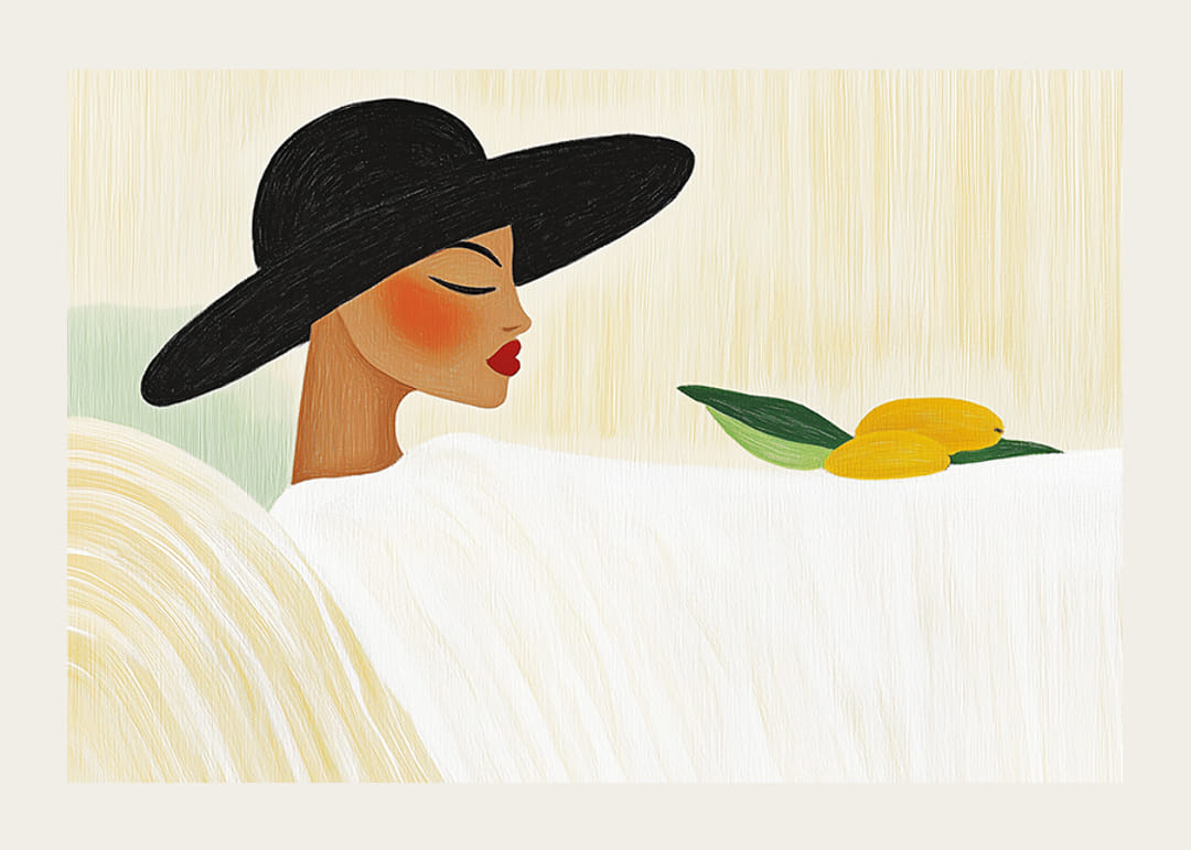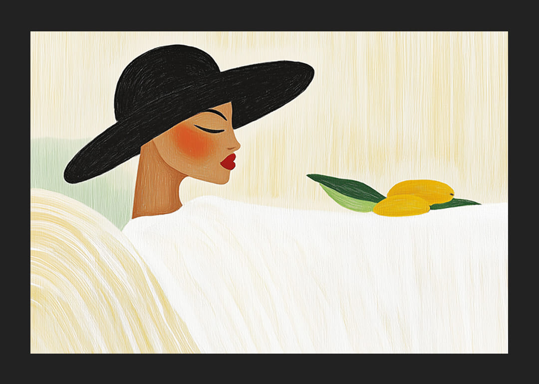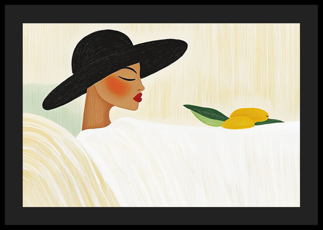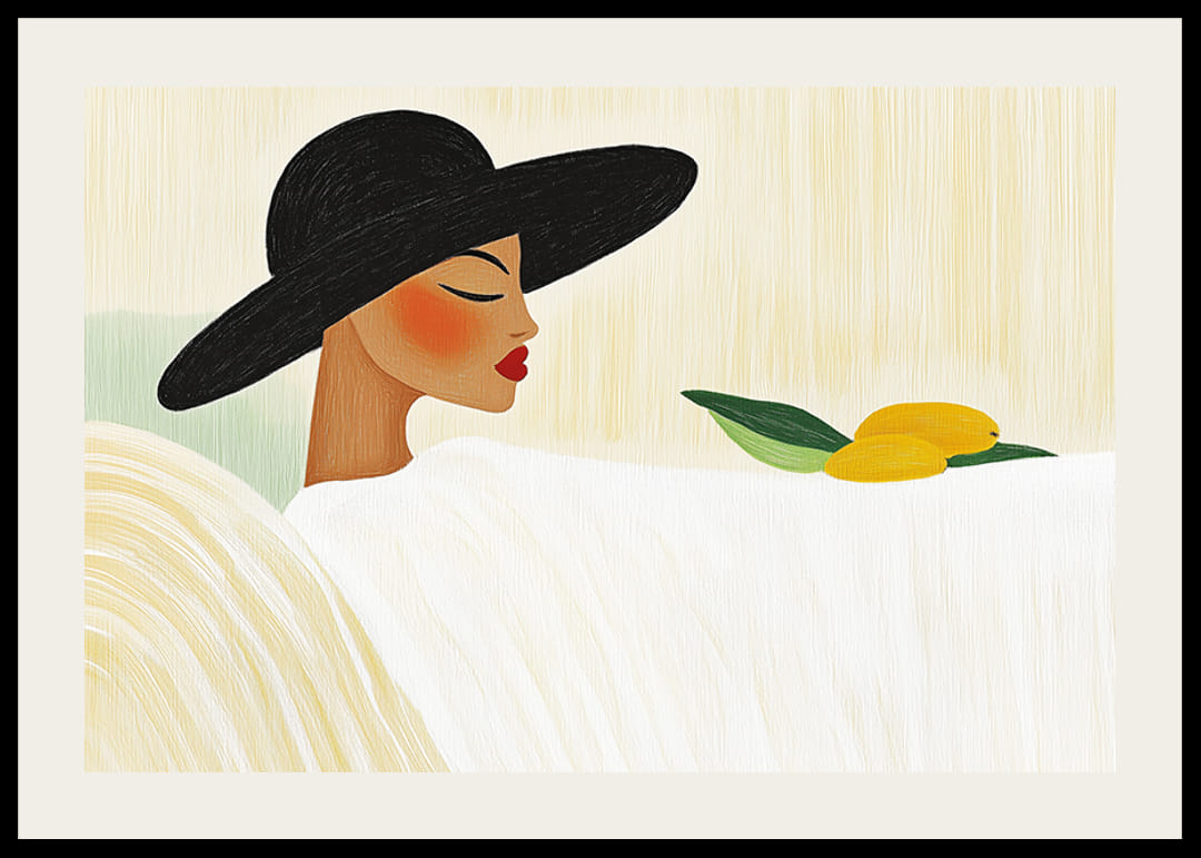 În acest poster vedem o femeie elegantă purtând o pălărie mare neagră, odihnindu-se pe un fundal moale și ușor, creând o stare de calm și introspecție. Pielea ei netedă și buzele roșii sunt evidențiate de motivul simplu, în timp ce cele două lămâi cu frunze verzi adaugă o notă de prospețime.