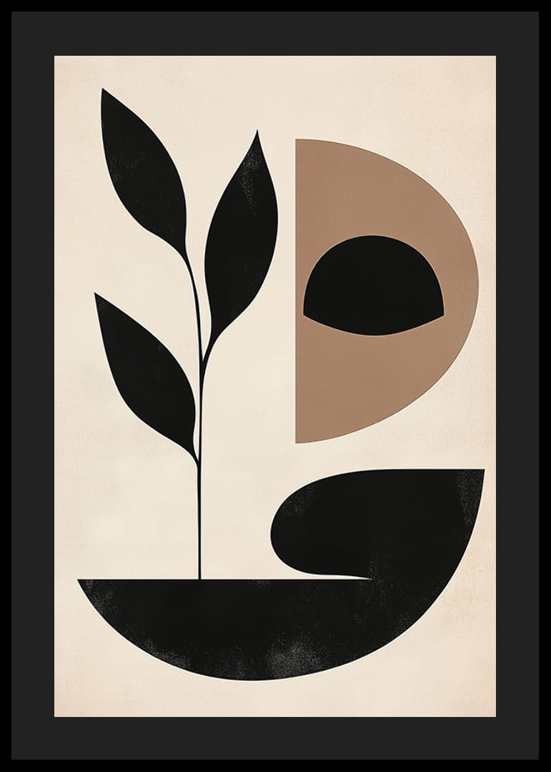 Acest poster surprinde atât esența naturii, cât și a designului cu formele sale elegante, geometrice și culorile contrastante. O silueta neagră a vegetației este combinată cu cercuri maro moi, creând un echilibru armonios și profunzime.