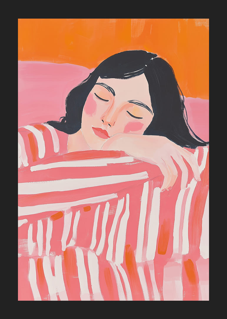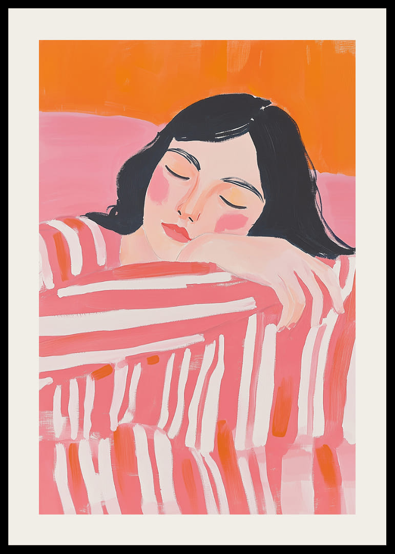 Posterul atrage atenția prin culorile sale vibrante și o senzație de odihnă profundă. Înfățișează o femeie liniștită, îmbrăcată în dungi, înconjurată de o paletă moale de roz și portocaliu, care radiază căldură și liniște. Acest poster aduce o energie calmă în camera ta, creând în același timp un sentiment de pace și armonie. Perfect pentru a adăuga o pată de culoare și o atmosferă liniștită în sufrageria ta.