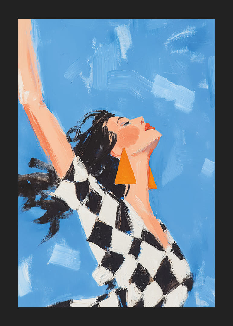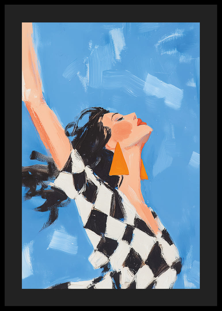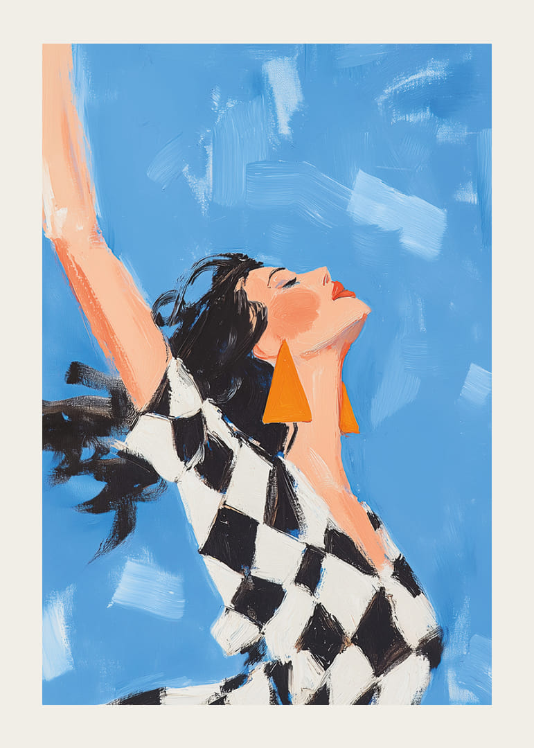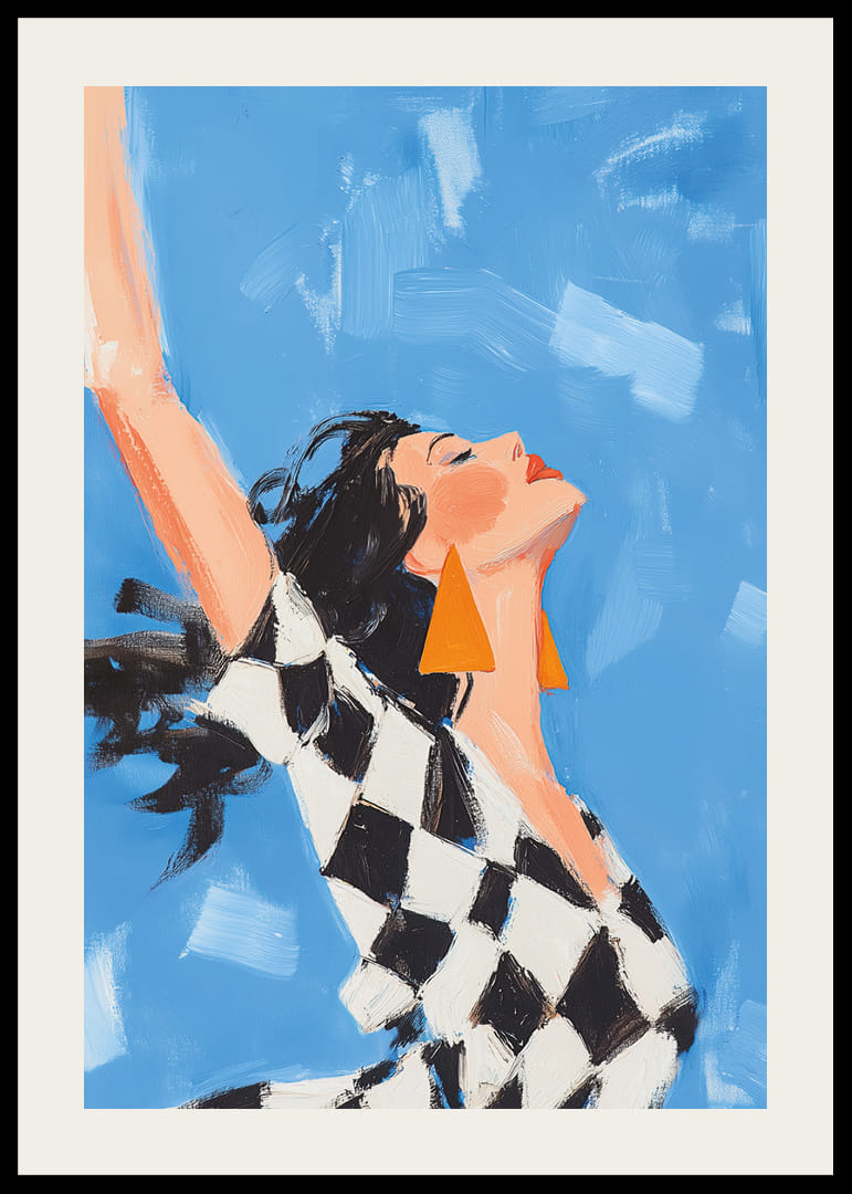 Acest poster surprinde o femeie într-un moment de libertate pură și radiantă, cu vântul jucându-se în părul ei și nuanțele albastre ale cerului aducând momentul la viață. Expresia de bucurie a femeii și bijuteriile ei îndrăznețe, geometrice, creează un sentiment de euforie și stil. Acest poster va fi o piesă centrală inspiratoare, care va ridica atmosfera oricărei camere și va oferi un sentiment de optimism și energie.