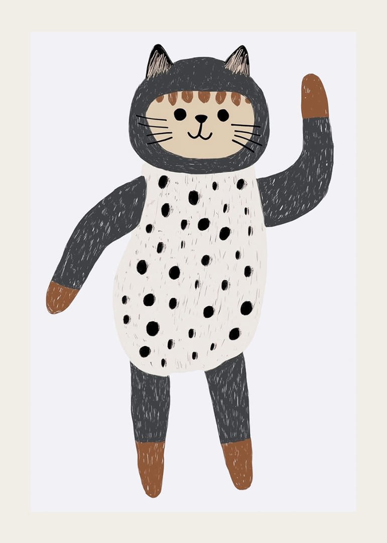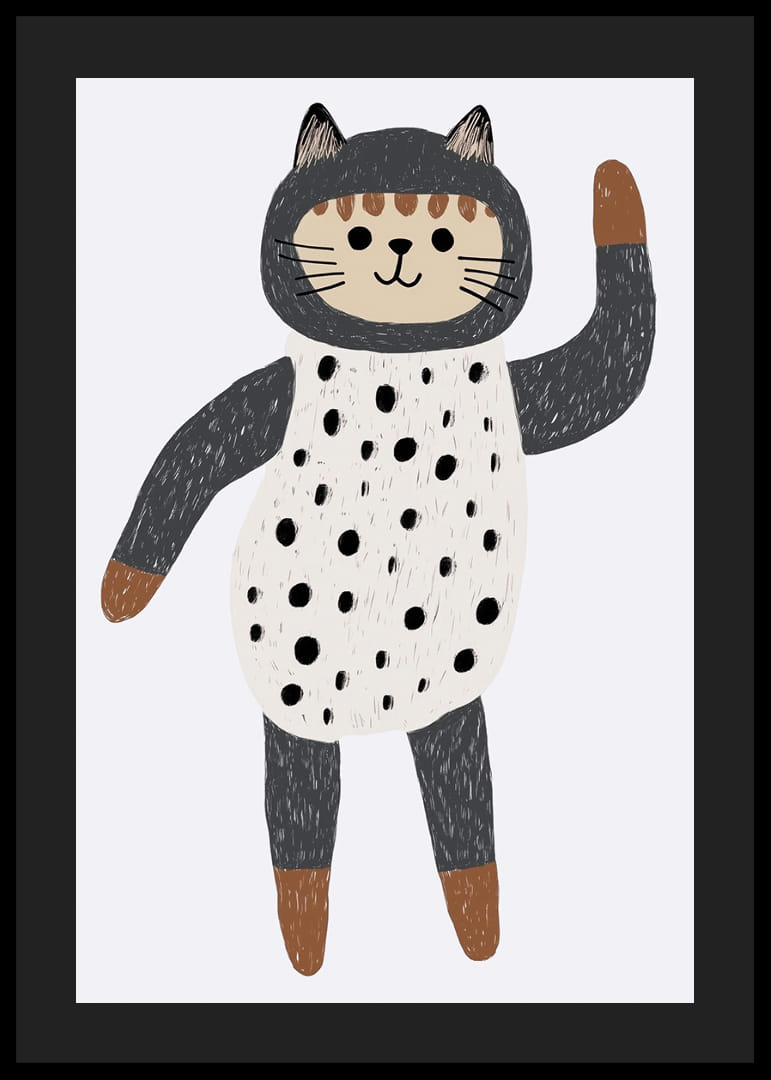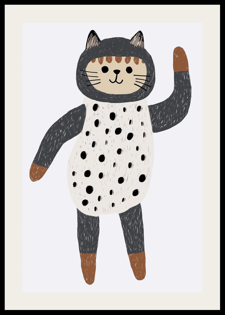 Acest poster surprinde o pisică fermecătoare îmbrăcată într-o ținută fantezistă cu buline, care face cu mâna privitorului. Cu culorile sale delicate și designul jucăuș, posterul creează o atmosferă jucăușă și primitoare. Pisica, cu expresia sa adorabilă, adaugă un sentiment de bucurie și ușurință oricărei camere pe care o împodobește, fiind un detaliu perfect pentru a îmbunătăți atmosfera din casă.