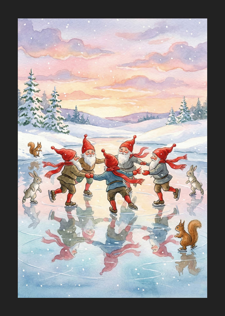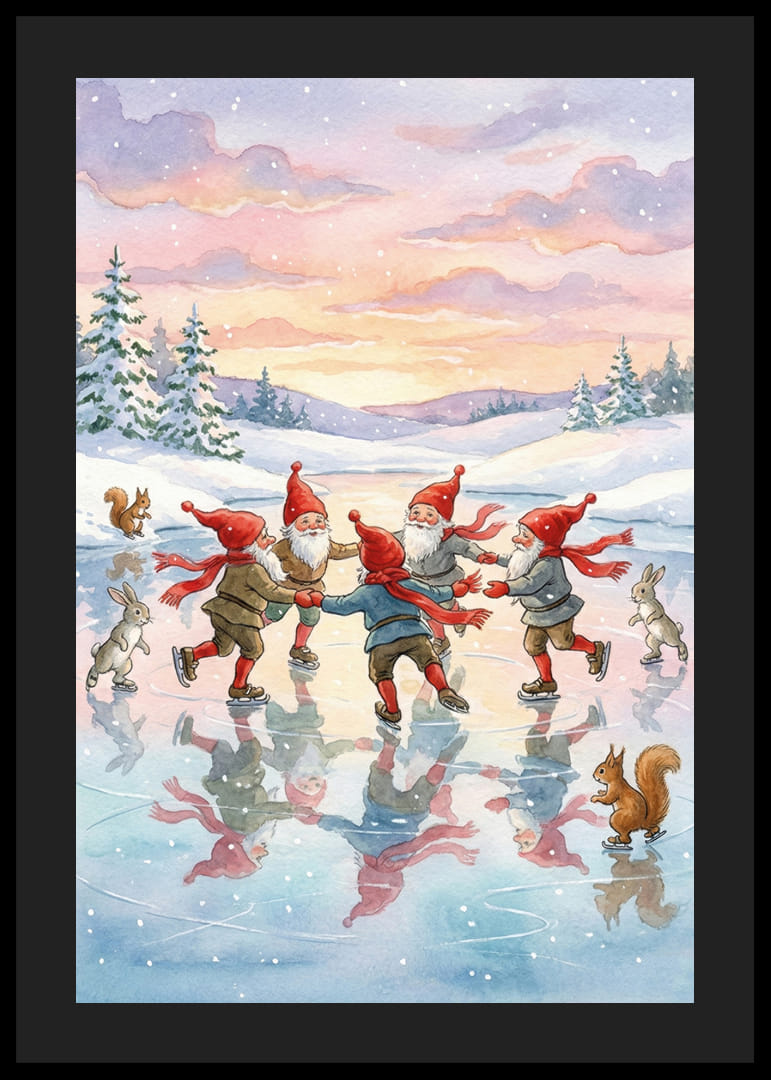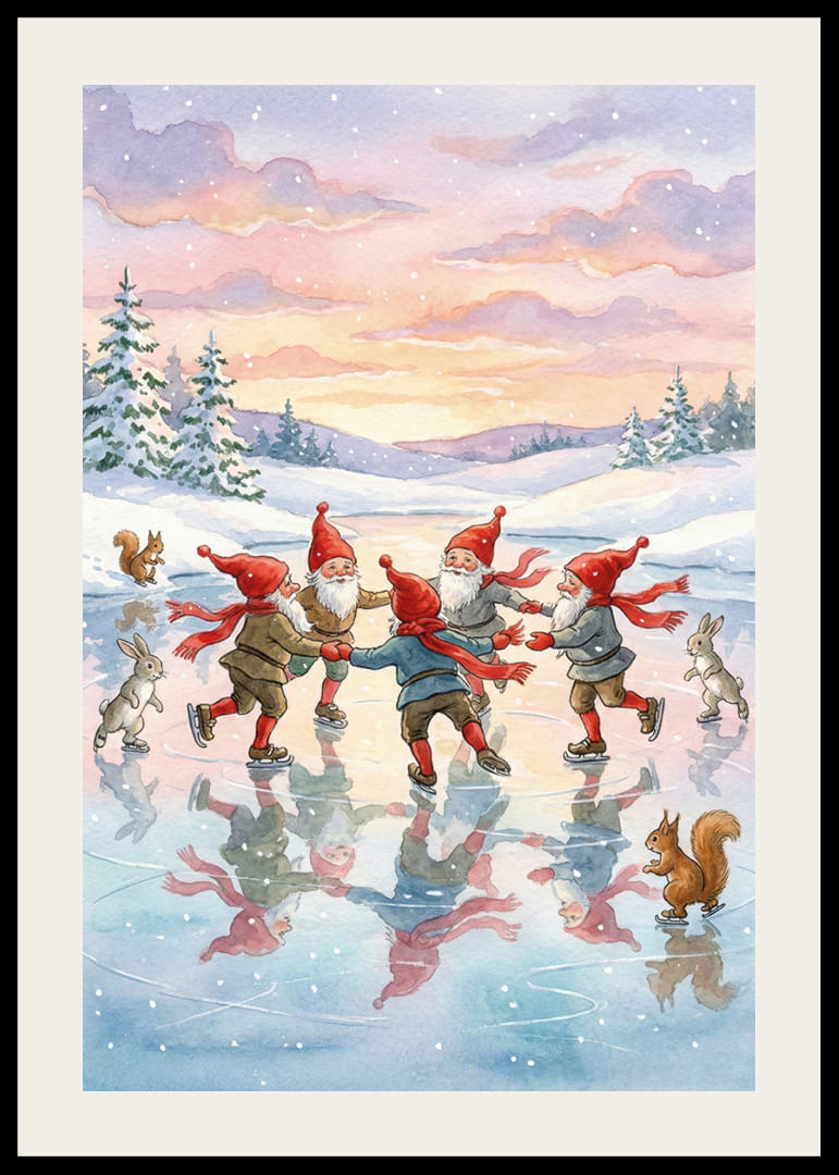 Acest poster surprinde farmecul unui peisaj magic de iarnă, unde patru elfi cu pălării roșii vesele dansează pe gheața strălucitoare. Cu cerul pastelat și brazii înzăpeziți din jur, se creează o atmosferă visătoare și jucăușă. Reflexiile de pe gheață sporesc senzația imaginativă, făcând din acest poster un plus fermecător pentru orice casă care caută căldură și bucurie în timpul iernii.
