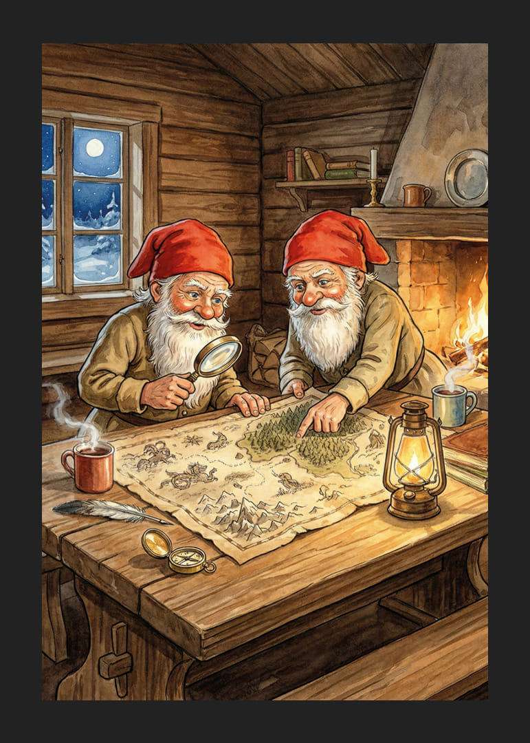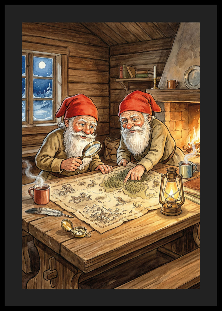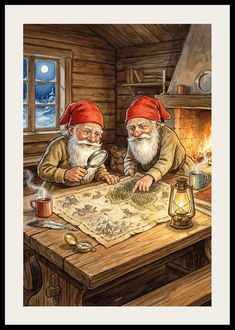 În acest poster fermecător, doi elfi pornesc într-o expediție misterioasă lângă un foc care trosnește. Pălăriile lor roșii strălucesc în lumina caldă a focului, iar studiile lor de hărți dau o senzație de aventură. Întreaga scenă este înconjurată de calmul serii reci de iarnă care se vede prin fereastră. Acest poster va transforma orice casă într-un loc plin de imaginație și căldură, adăugând o notă minunată de magie lunilor de iarnă.