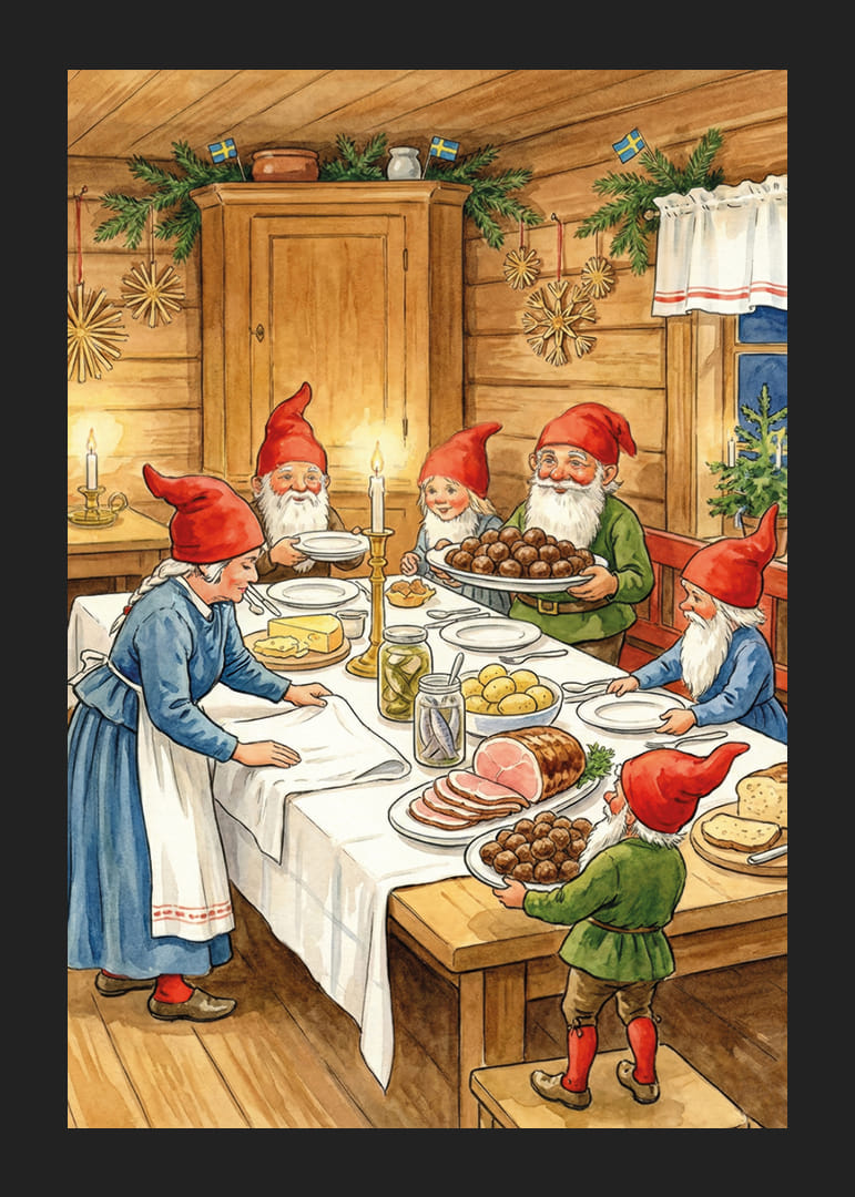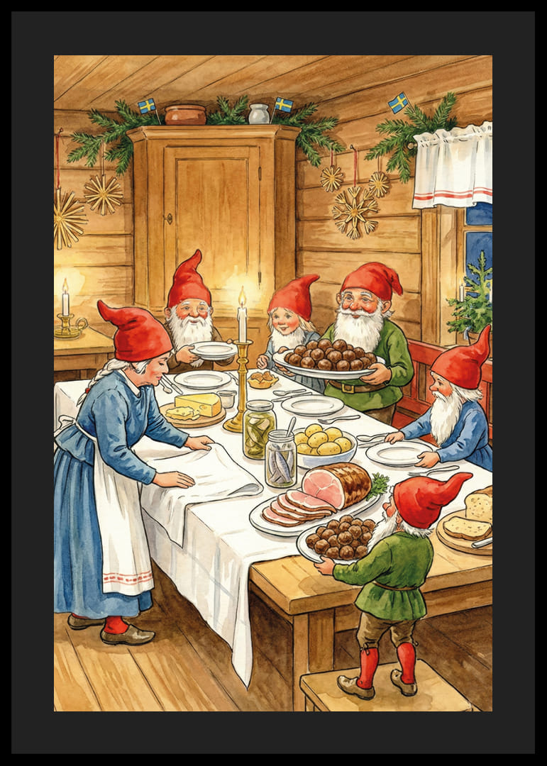 Acest poster minunat surprinde atmosfera magică a unui Crăciun nordic tradițional. Un grup de elfi fericiți se adună în jurul unei mese pline cu mâncare de Crăciun, cu elemente de molid verde decorate în fundal. Lumina lumânărilor creează o atmosferă caldă și primitoare. Acest poster răspândește bucurie și comunitate și oferă fiecărei case un sentiment de tradiție și spirit de Crăciun care durează tot sezonul.