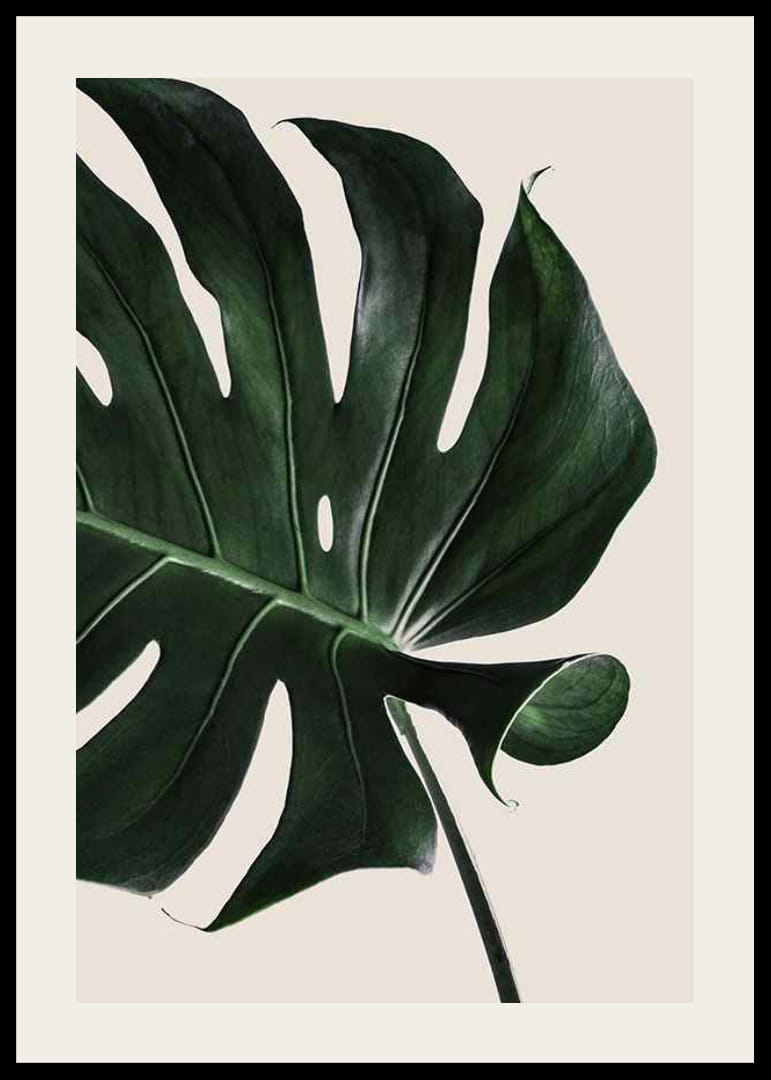 Un prim-plan al unei frunze de monstera se întinde pe un fundal bej deschis, evidențiind tonurile de verde închis și textura naturală a frunzei. Găurile caracteristice și forma curbată a frunzei îi conferă un aspect elegant. Acest poster combină simplitatea botanică cu o notă modernă și se va potrivi majorității mediilor de acasă.