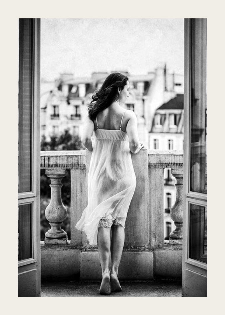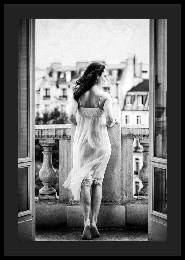 O femeie stă desculță, într-o cămașă de noapte ușoară, pe un balcon, cu spatele la cameră, privind spre fațadele clasice ale primăriei din fundal. Ușile deschise ale balconului încadrează subiectul și dau o senzație de deschidere. Tonul alb-negru conferă posterului un caracter atemporal și elegant, potrivit atât pentru dormitoare, cât și pentru camere de zi.