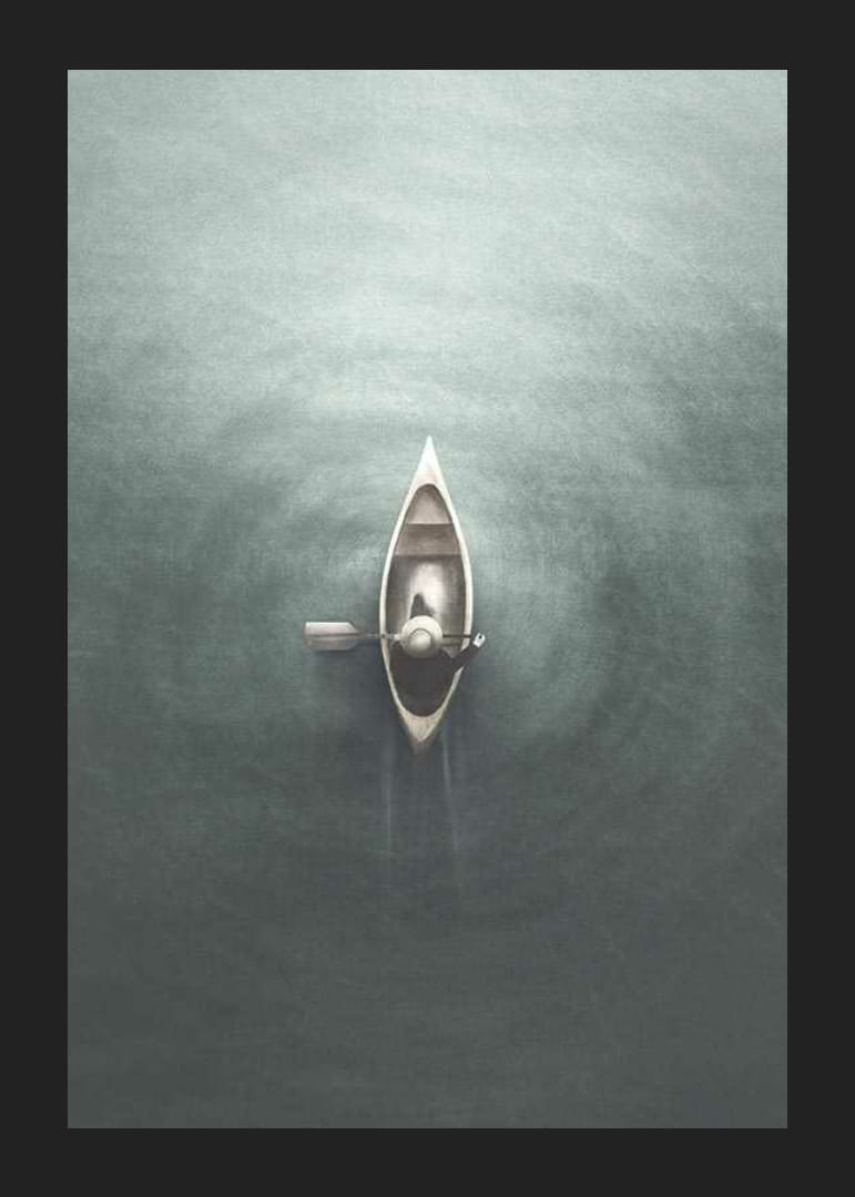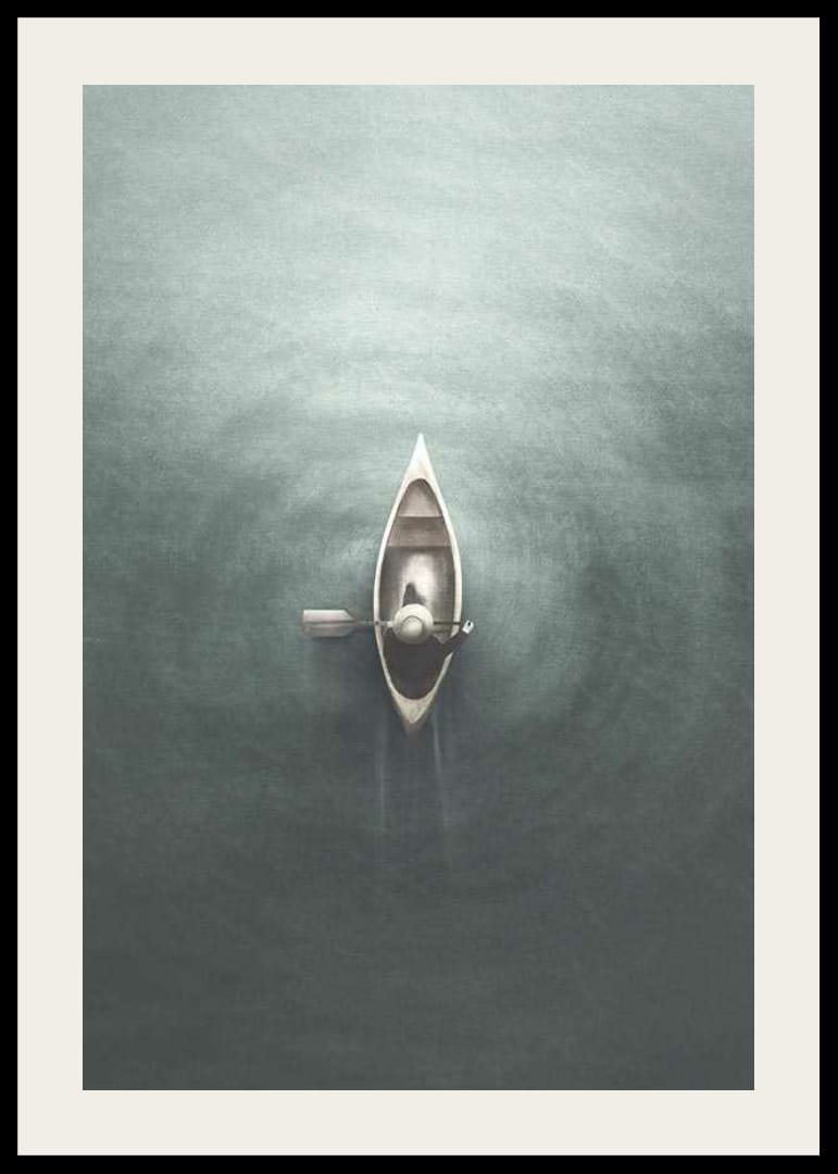 Motivul constă dintr-o canoe mică cu o persoană singură, văzută de sus, înconjurată de cercuri delicate pe apa gri-albăstruie. Culorile estompate și formele simple conferă posterului o expresie calmă, conceptuală. Potrivit pentru camerele în care se caută o senzație de calm sau reflecție.