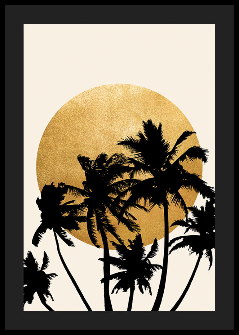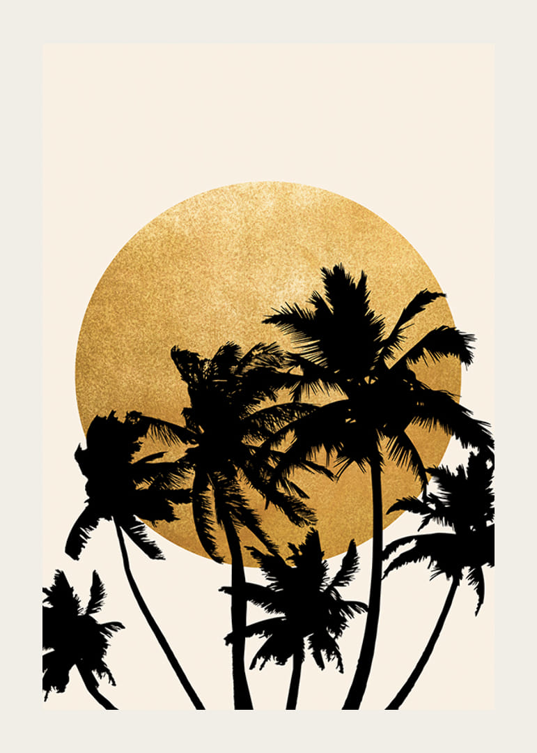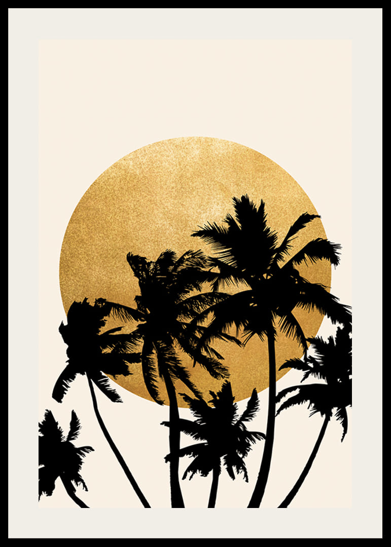 Palmieri în siluetă neagră se întind în fața unui cerc galben mare, asemănător unui soare, plasat pe un fundal uni, de culoare nisip. Contrastele grafice și designul simplu conferă posterului o notă modernă și calmă. Se potrivește la fel de bine deasupra canapelei, cât și într-un dormitor luminos, unde natura inspiră designul interior.