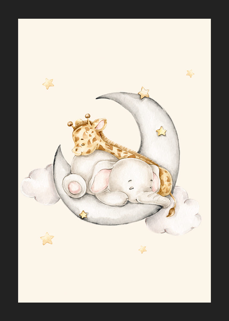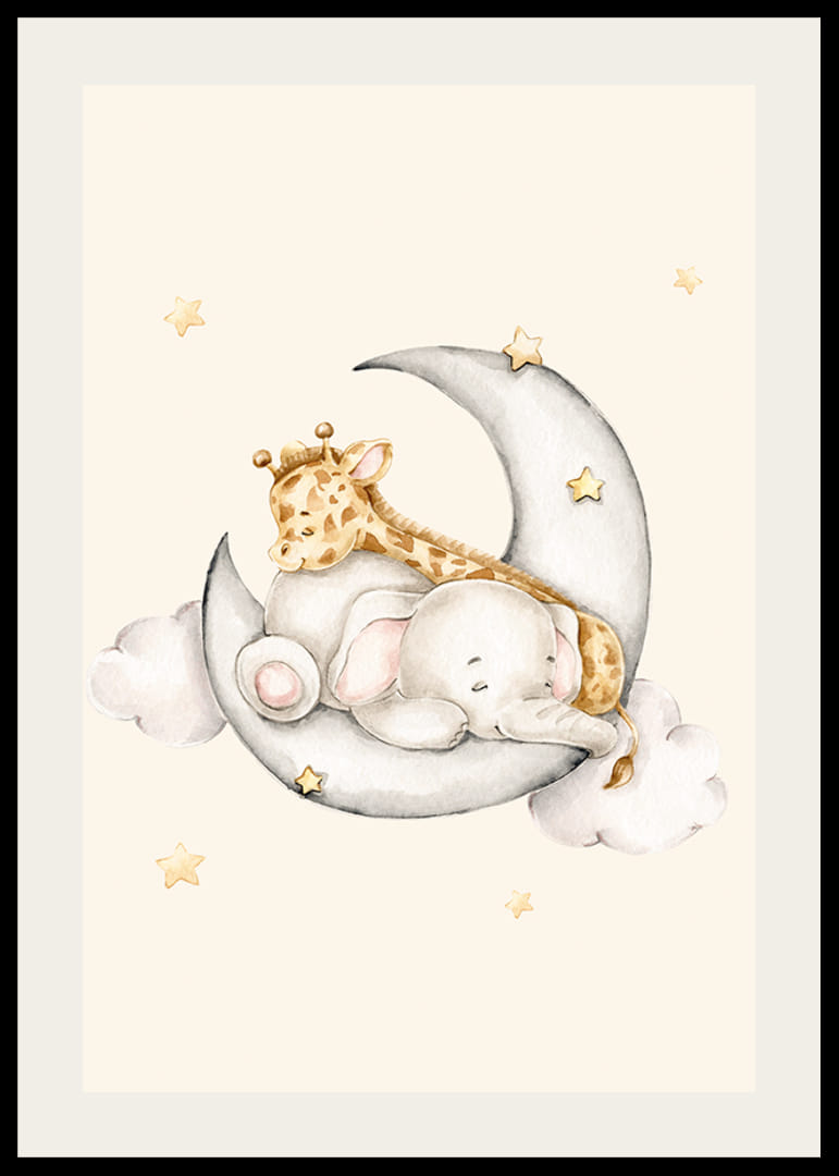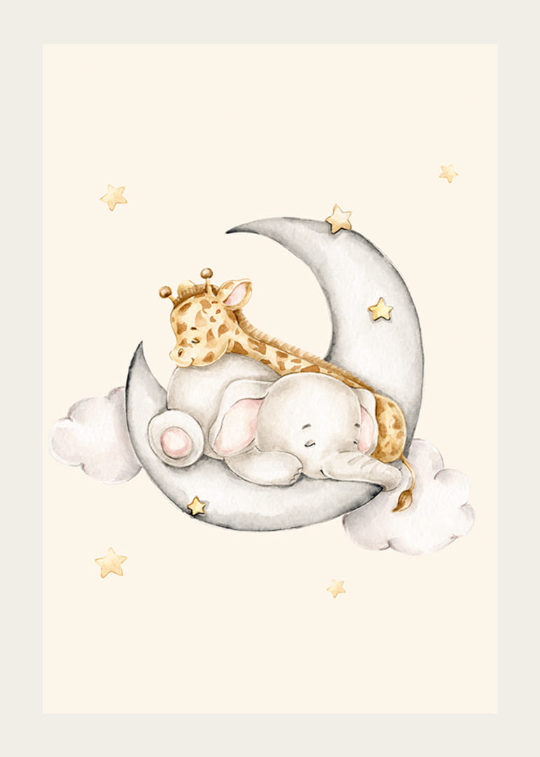 Două animale, un elefant mic și o girafă, dorm împreună pe o semilună gri, înconjurate de nori moi și stele aurii. Culorile blânde ale acuarelei pe un fundal bej nisipos dau o senzație de căldură. Acest poster va fi un detaliu frumos în camera copiilor și va contribui cu o impresie de liniște interiorului.