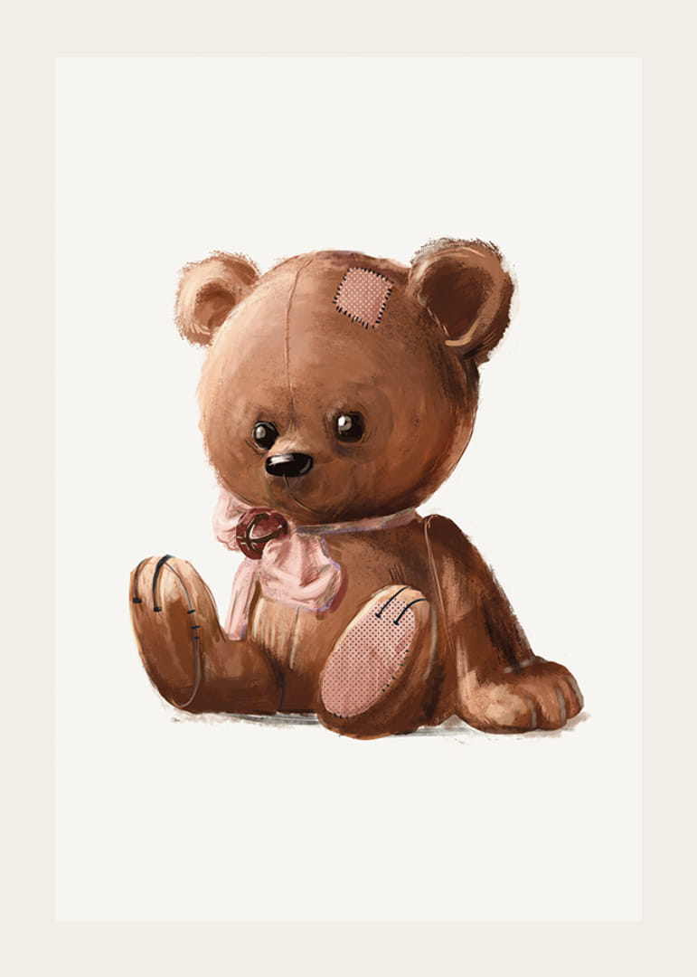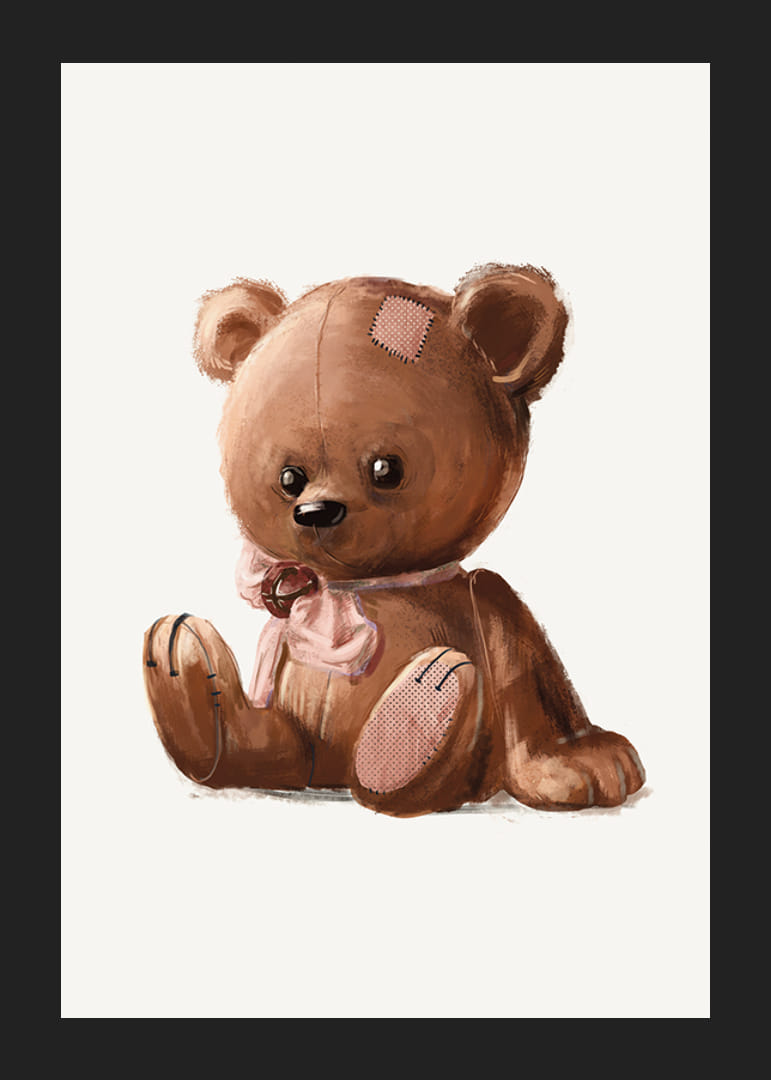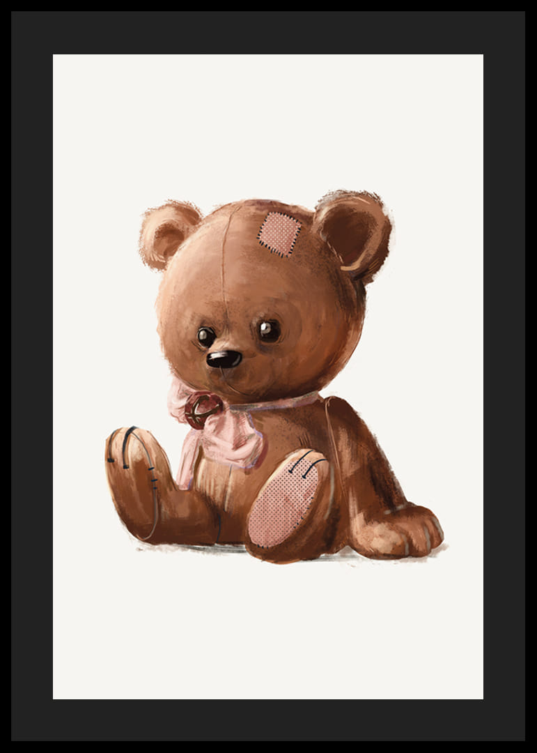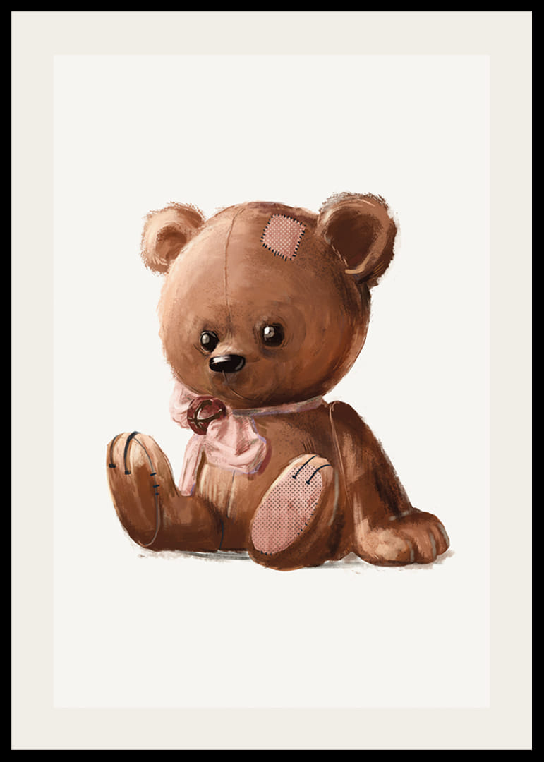 Ursuleț de pluș șezând în nuanțe de maro, ilustrat cu detalii cusute clare, petice pe cap și labă și o fundă roz în jurul gâtului. Fundalul moale și deschis evidențiază formele rotunde ale ursulețului. Acest poster creează o atmosferă primitoare și nostalgică în camerele copiilor și se potrivește bine în diverse medii pentru copii.