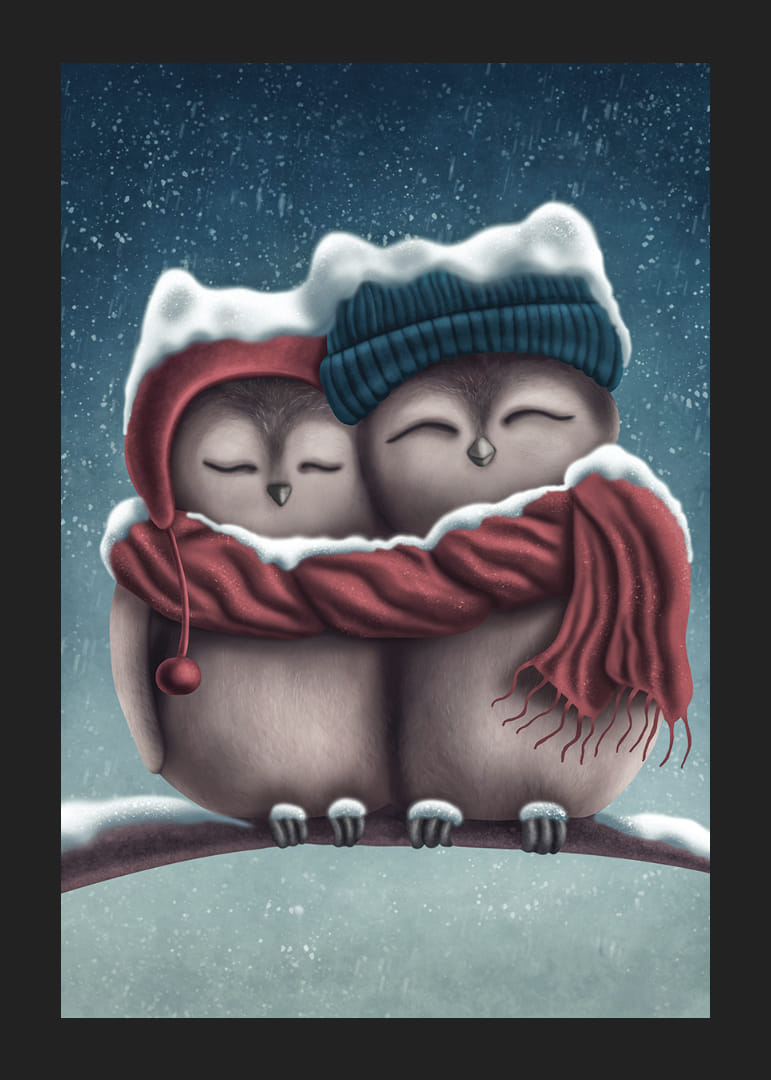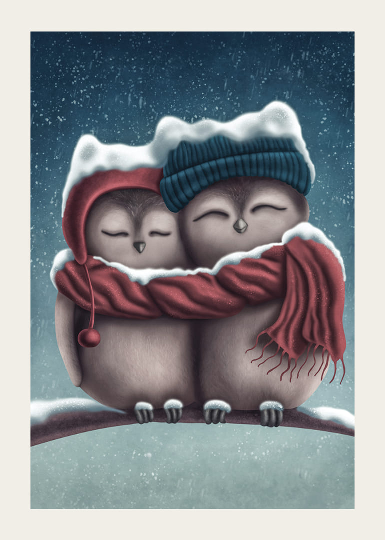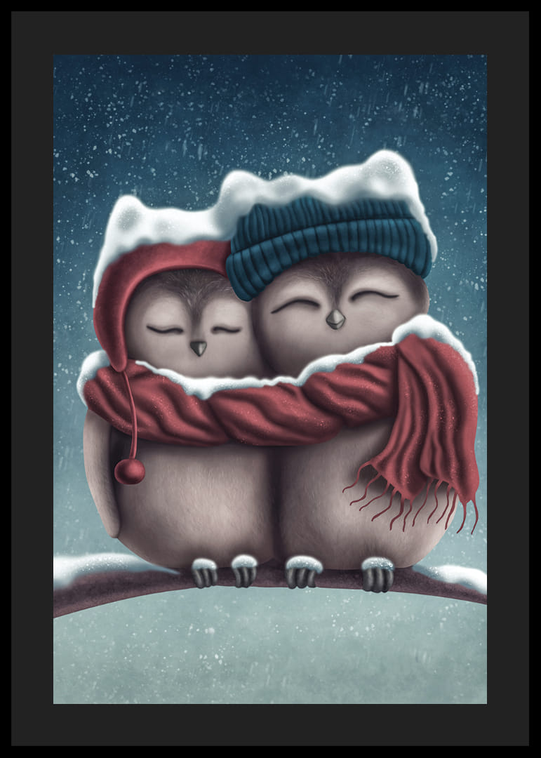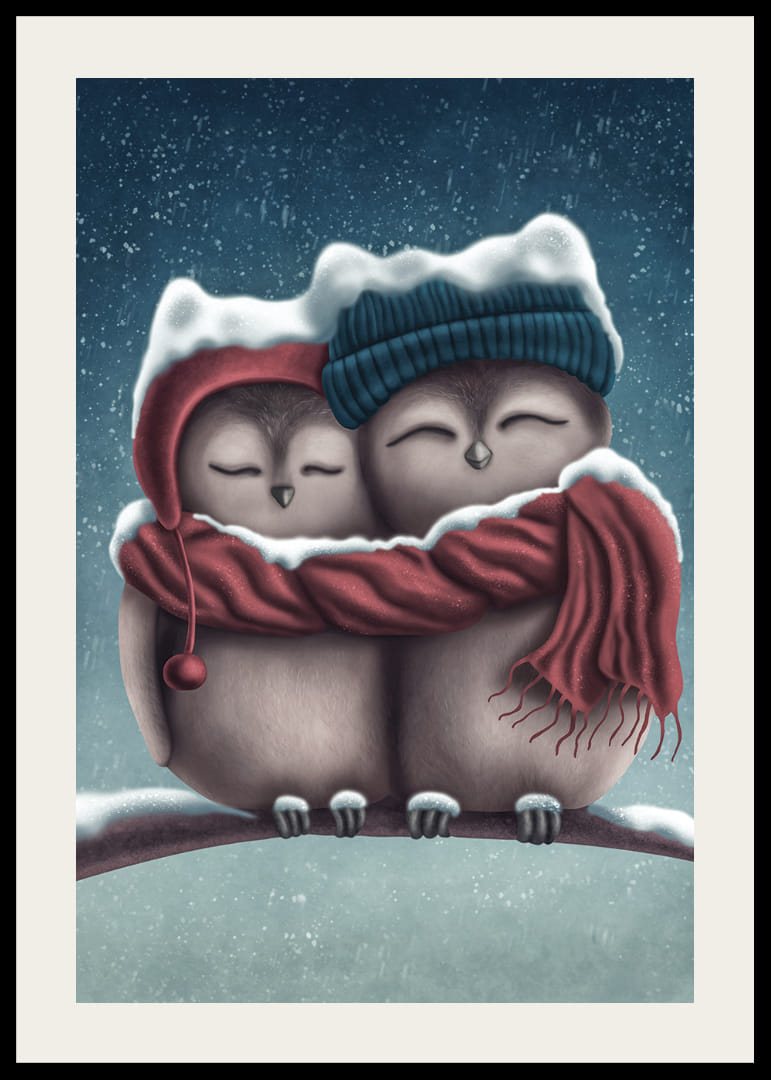 Două bufnițe din desene animate stau aproape una de alta pe o creangă, înfășurate într-o eșarfă roșie și fiecare purtând o pălărie acoperită de zăpadă. Fundalul este în tonuri reci de albastru, iar fulgii de zăpadă cad ușor. Motivul inspirat de iarnă conferă o notă jucăușă și face ca acest poster să fie popular în camerele copiilor pe tot parcursul sezonului de iarnă.