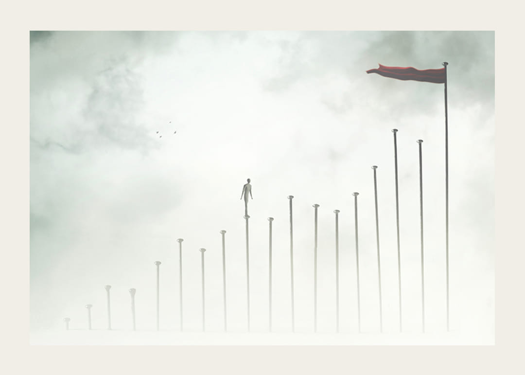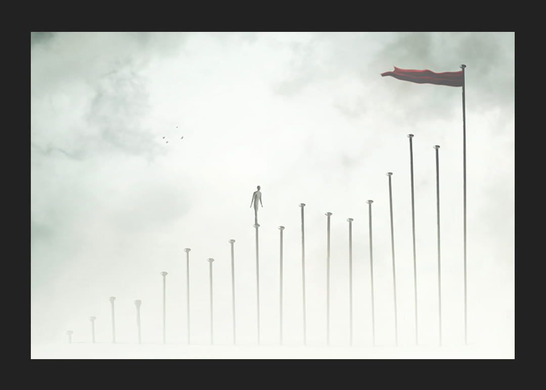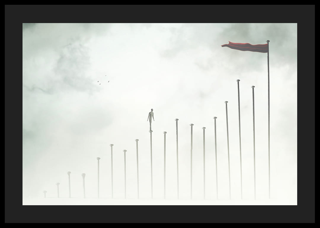O figură solitară se echilibrează sus pe o serie de stâlpi subțiri și înălțați, ducând spre un steag roșu într-un cadru luminos și învăluit în ceață. Tonurile de gri deschis și alb sporesc expresia visătoare și conceptuală. Acest poster oferă o notă modernă și atentă la detalii și se potrivește bine în camere de studiu, camere de zi sau medii creative.