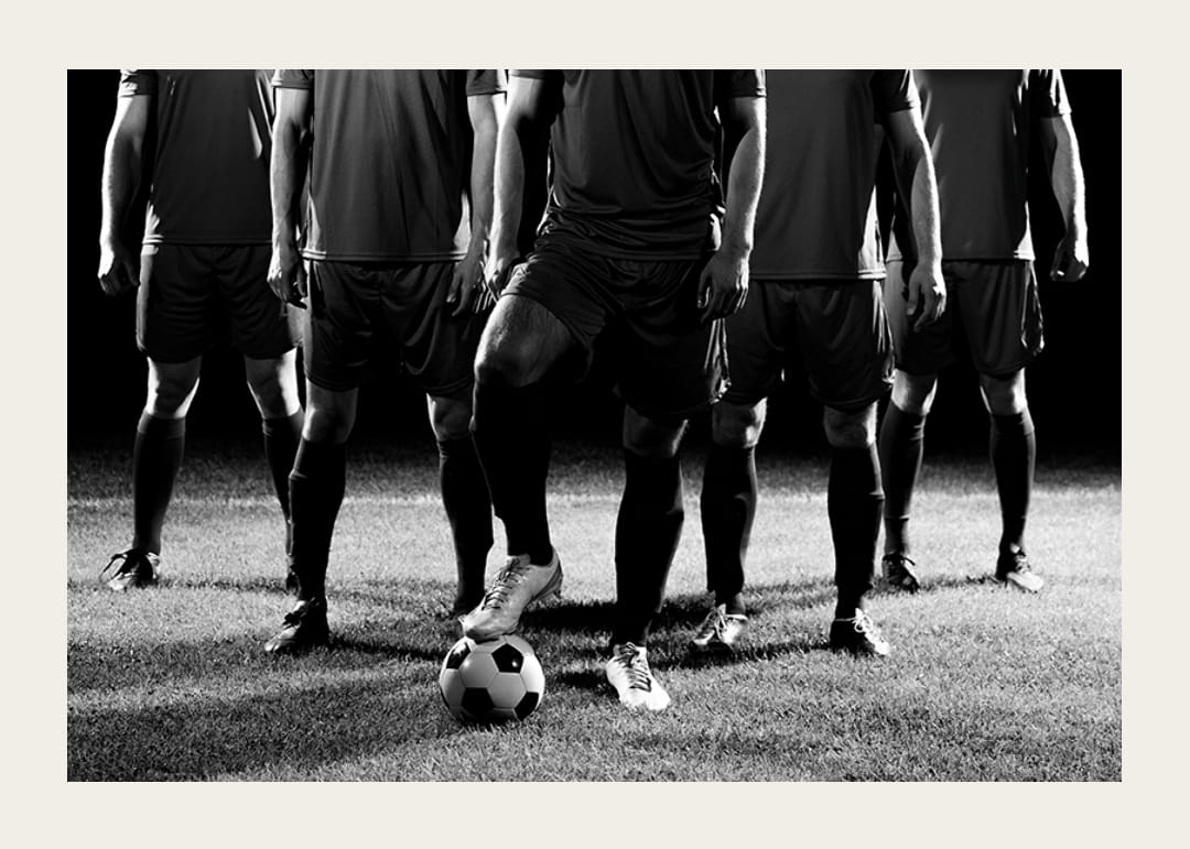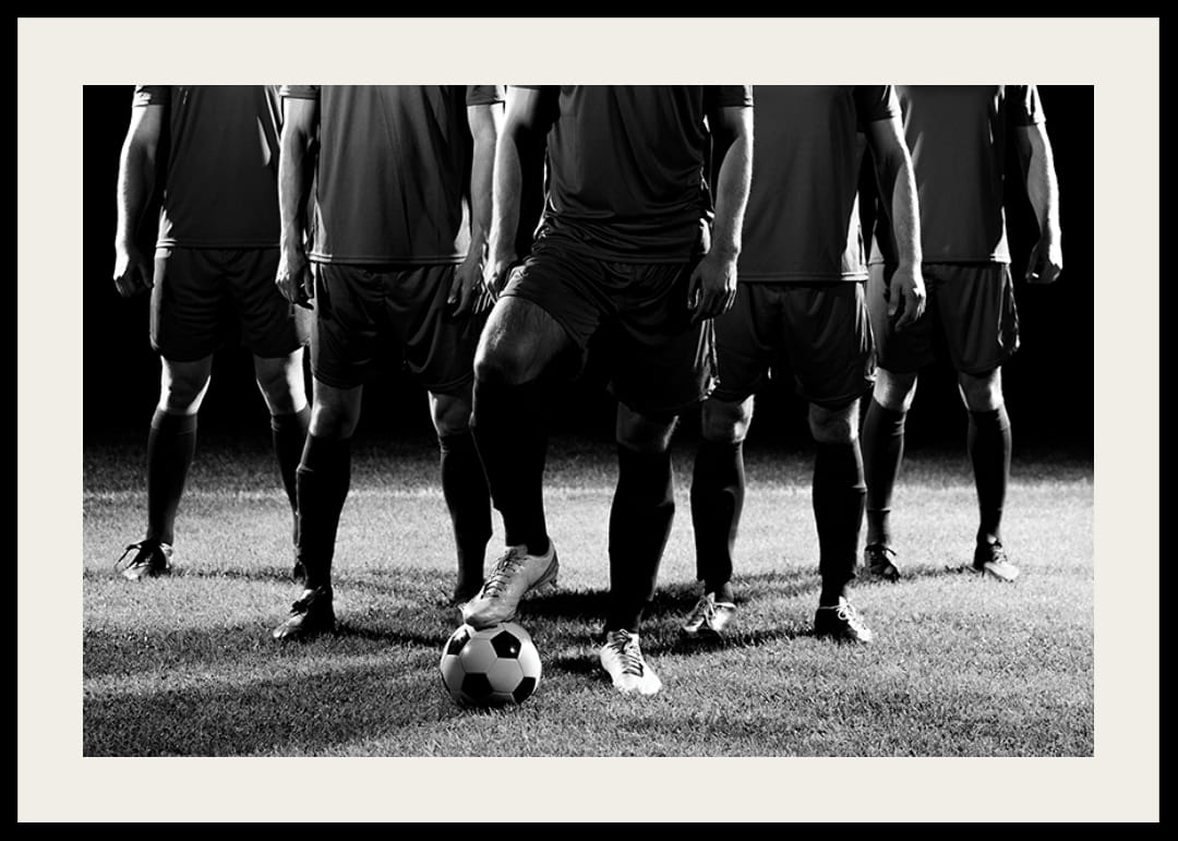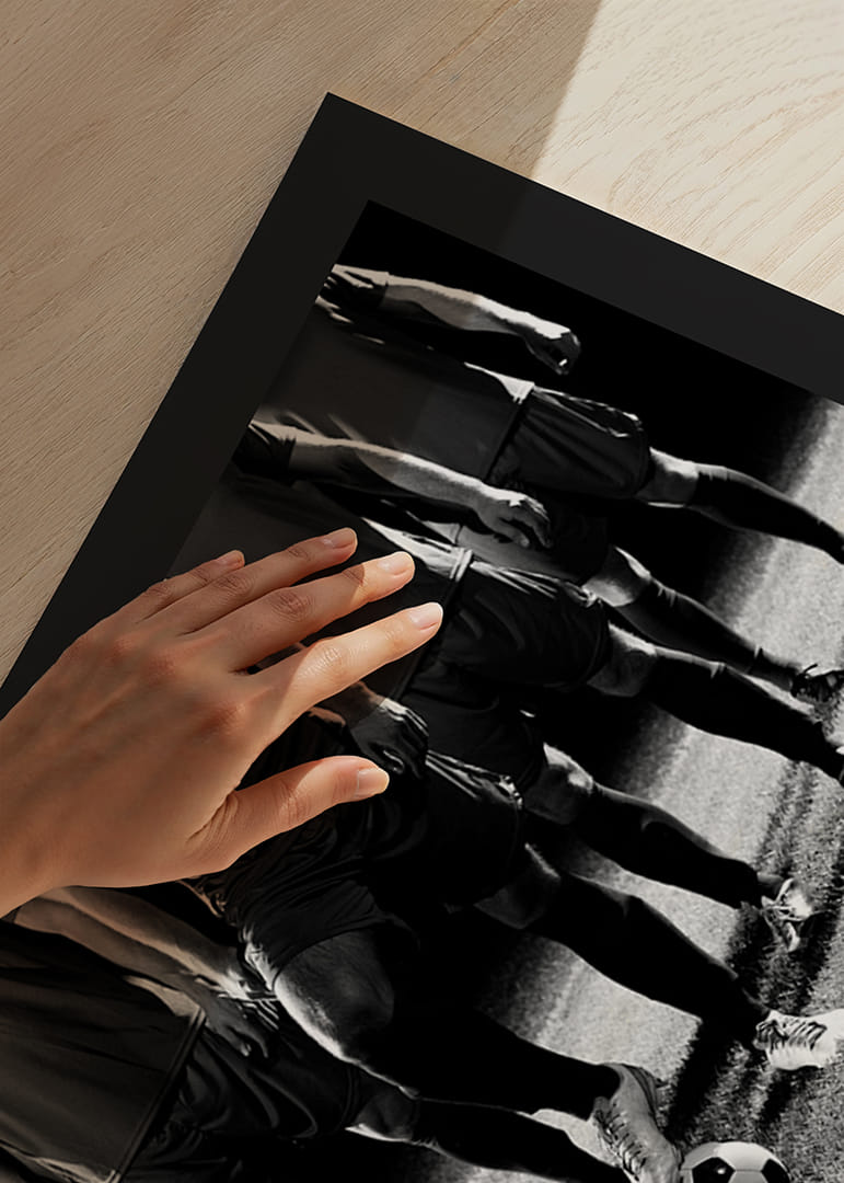 Cinci jucători de fotbal stau umăr lângă umăr în uniformele lor de meci, cu un jucător în mijloc, cu piciorul așezat pe o minge clasică alb-negru. Contrastul dintre lumina puternică și umbrele întunecate conferă motivului o expresie grafică. Acest poster este potrivit pentru camerele copiilor, sălile de antrenament sau alte medii dedicate iubitorilor de sport.
