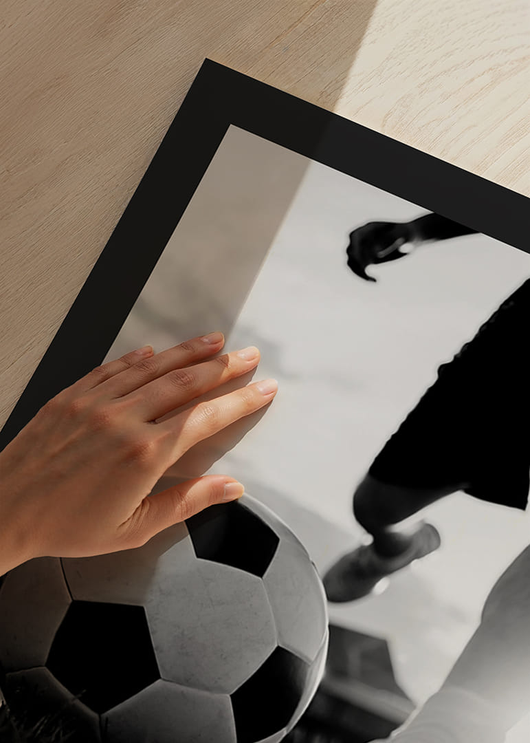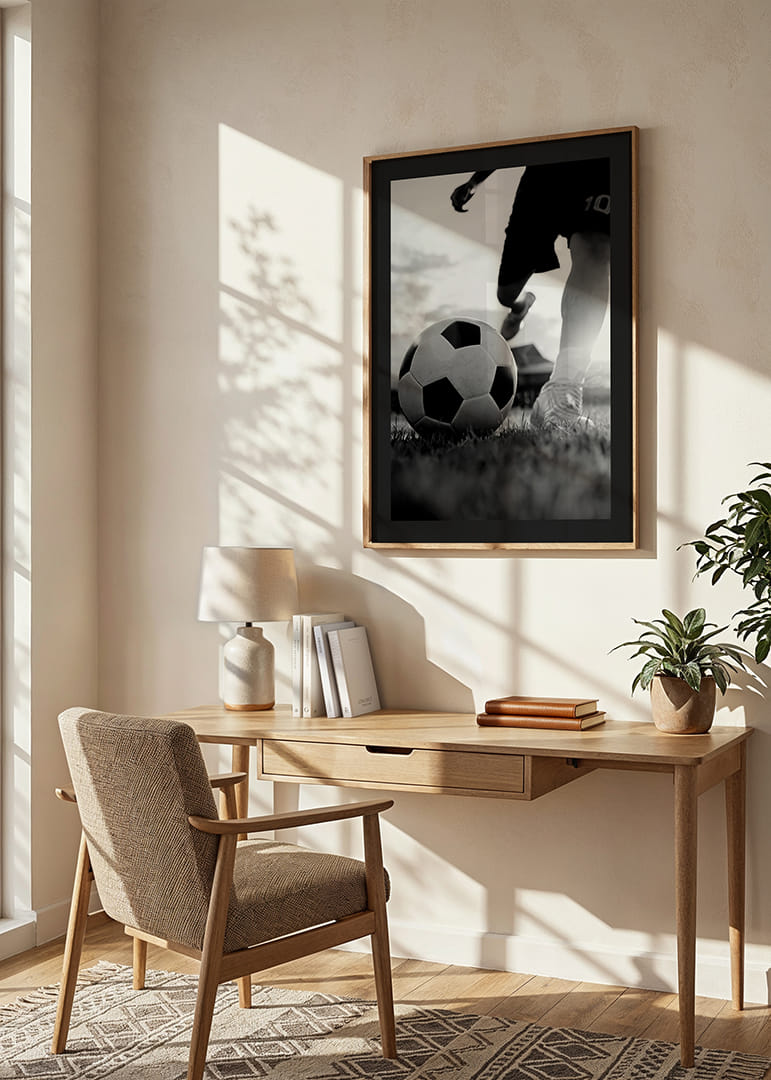 O minge de fotbal domină prim-planul, în timp ce un jucător se pregătește să șuteze pe un teren acoperit cu iarbă. Lumina din spate creează contraste clare și evidențiază mișcarea subiectului. Cu tonurile sale alb-negru, posterul dă o impresie elegantă, fiind o alegere potrivită pentru mediile sportive.