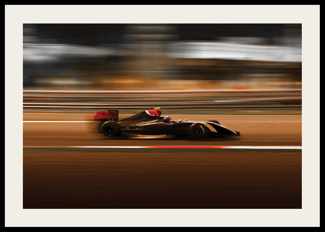 Motivul constă într-o mașină neagră de Formula 1 care gonește pe o pistă, surprinsă în mișcare cu un fundal neclar și tonuri calde de portocaliu-maro. Detaliile clare ale mașinii contrastează cu senzația dinamică a fundalului. Acest poster este potrivit pentru camerele în care energia și mișcarea sunt apreciate, cum ar fi camerele de studiu sau camerele pentru tineri.