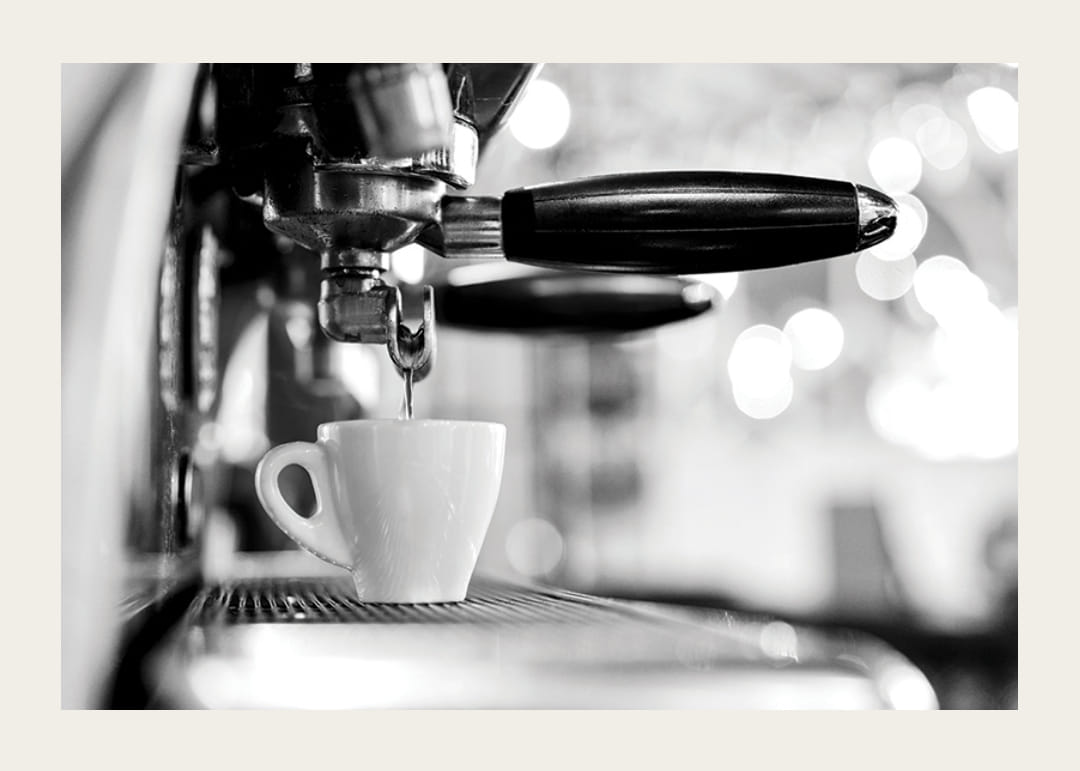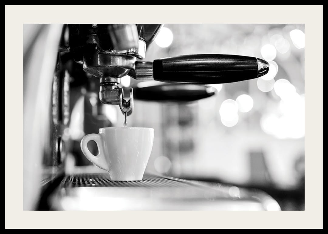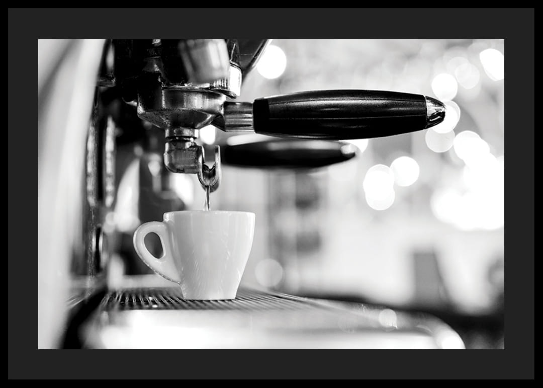 Prim-plan al unei cești de espresso albe plasate sub gura metalică a unui espressor, unde cafeaua este pe cale să se toarne. Fundalul este ușor estompat și surprinde lumina reflectată. Acest poster oferă o expresie modernă și elegantă și este o decorațiune excelentă pentru bucătăria iubitorului de cafea.