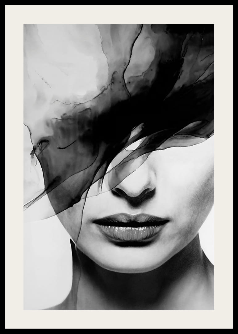 Poster din categoria modă care prezintă un portret artistic alb-negru al unei femei a cărei față este parțial acoperită de o formă de acuarelă abstractă, întunecată. Contrastul dintre detaliile ascuțite din trăsăturile femeii și cerneala lichidă, plutitoare, dă o senzație puternică și misterioasă.
