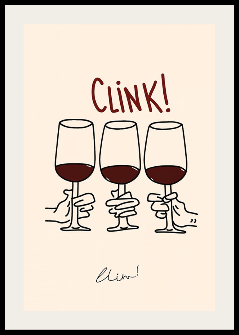 Afiș cu o ilustrație simplă și fermecătoare a trei pahare de vin cu vin roșu ca toasturi. Deasupra ochelarilor este cuvântul „CLINK!” scris într-un stil jucăuș și scris de mână.