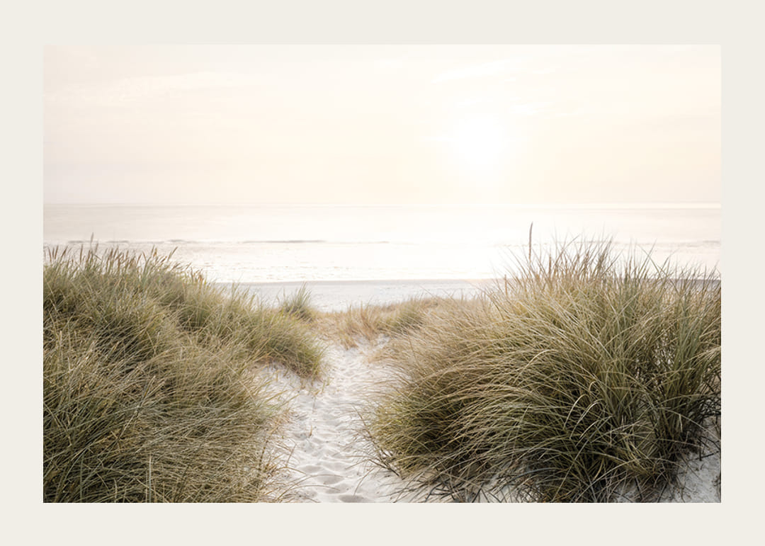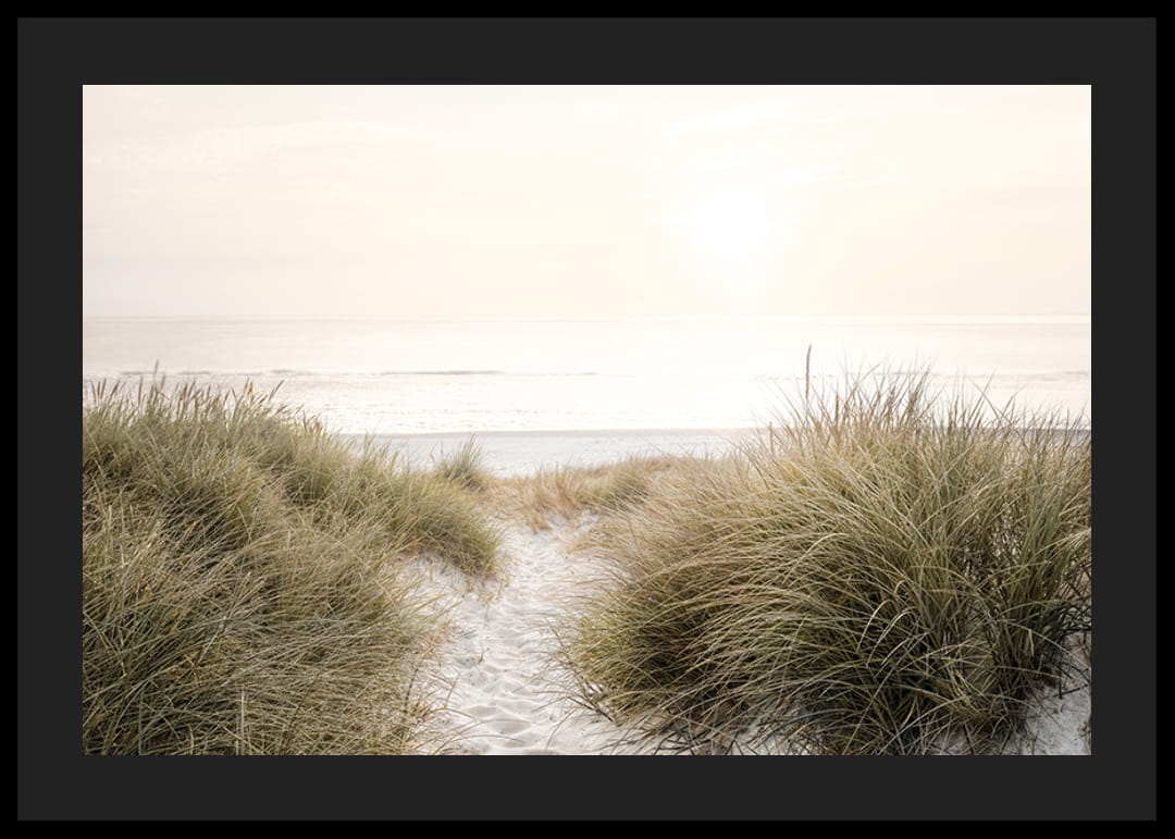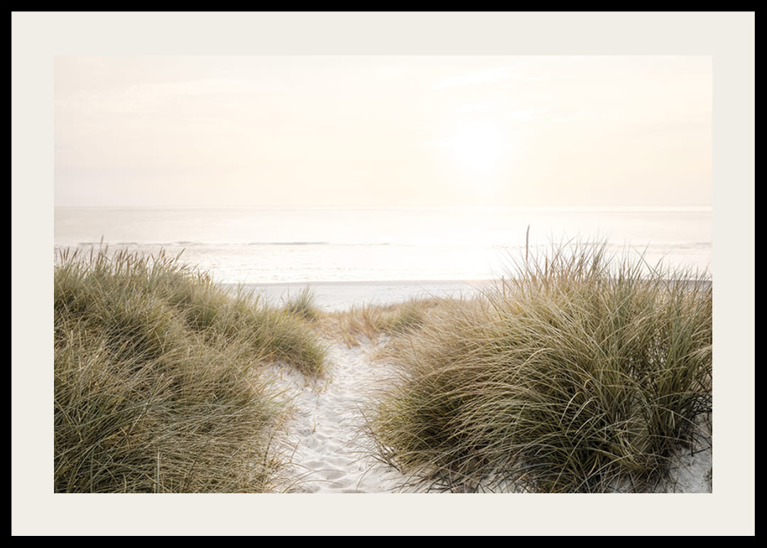Acest poster surprinde un răsărit liniștit de soare pe o plajă curată, încadrată de dune de nisip moale și iarbă sălbatică. Perfect pentru a crea un sentiment de calm și frumusețea naturii în casa sau biroul tău. Lăsați această imagine să vă inspire visele de relaxare și viață de plajă.