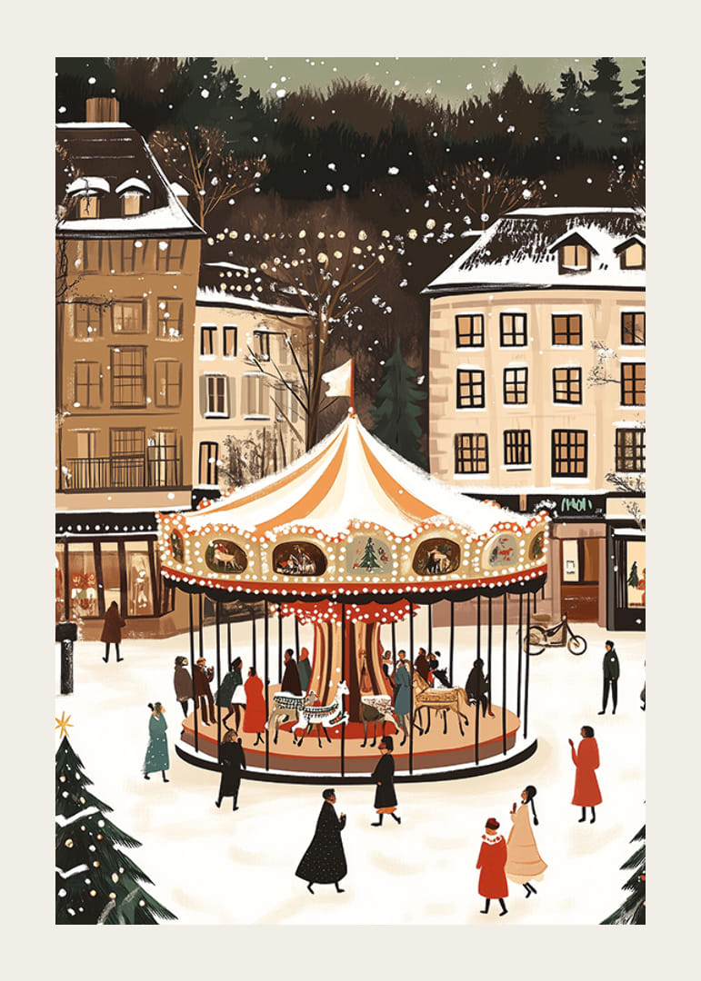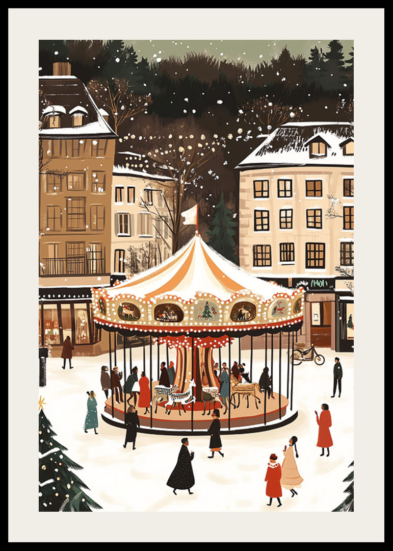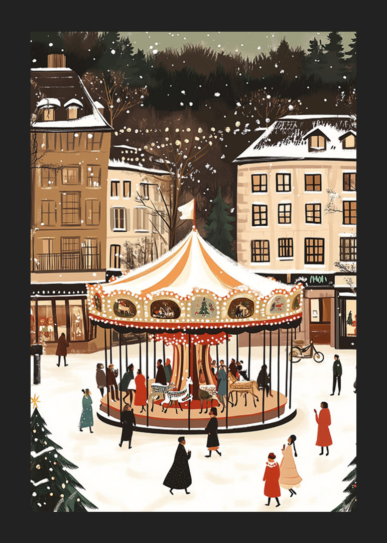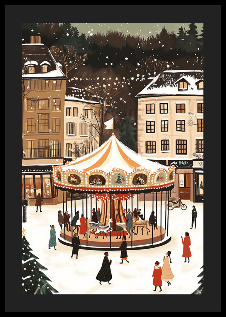 Acest poster surprinde inima unui sat de iarnă cu caruselul său fermecător decorat în toate culorile Crăciunului. Zăpada cade încet peste acoperișuri, luminând scena veselă. Oameni îmbrăcați în haine colorate se adună în jurul caruselului, răspândind bucurie și căldură.