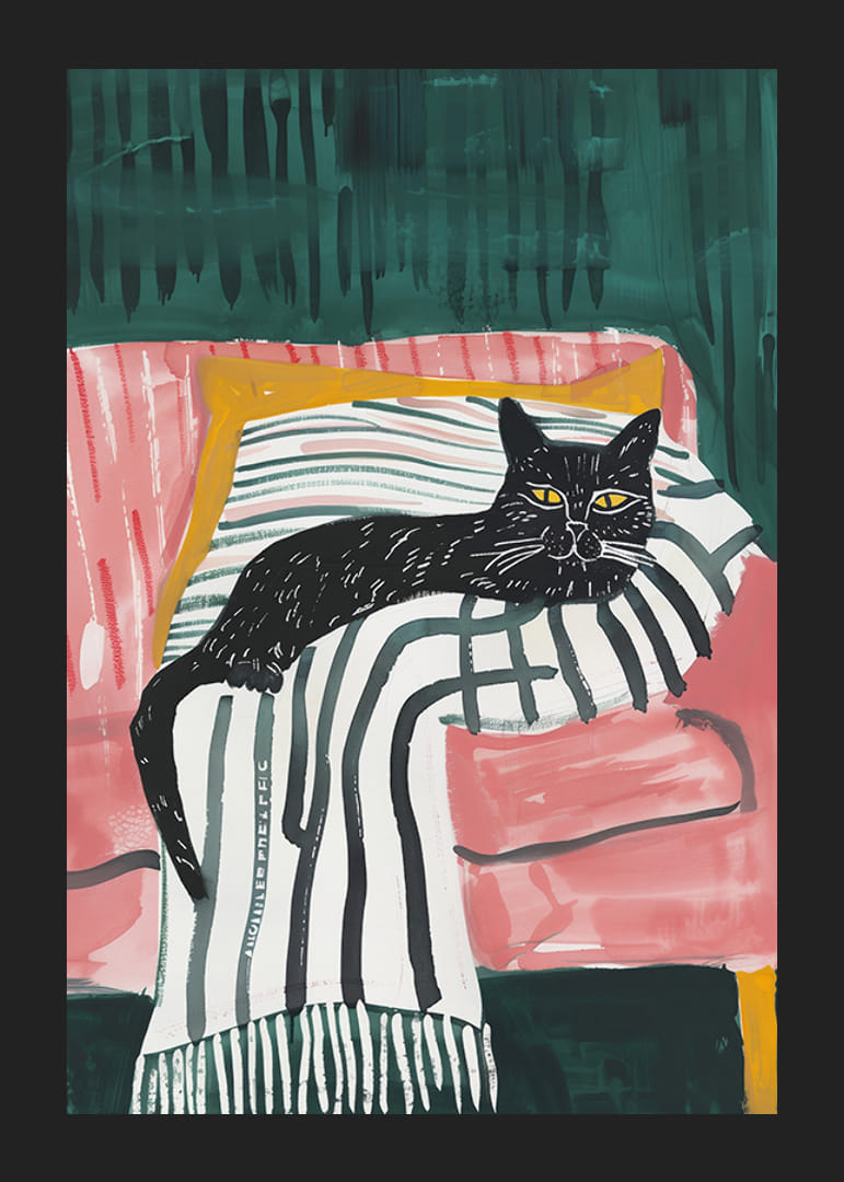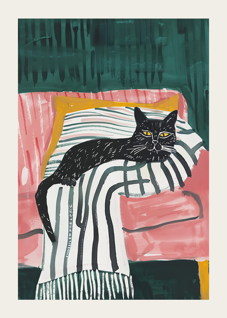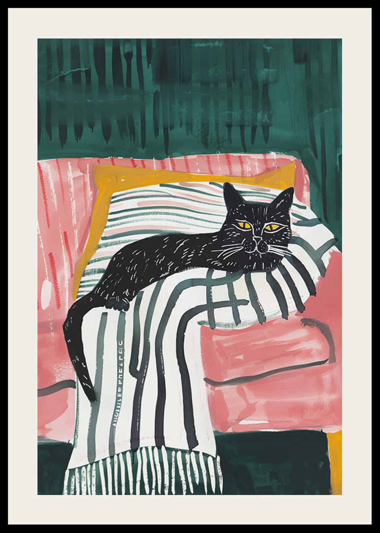 Acest poster elegant prezintă o pisică neagră cu ochi intensi, aurii, odihnindu-se relaxată pe o pătură cu dungi într-un fotoliu roz. Contrastele îndrăznețe de culoare și pensulele artistice creează o senzație modernă și atrăgătoare.