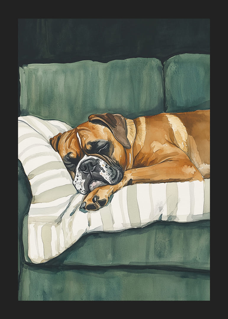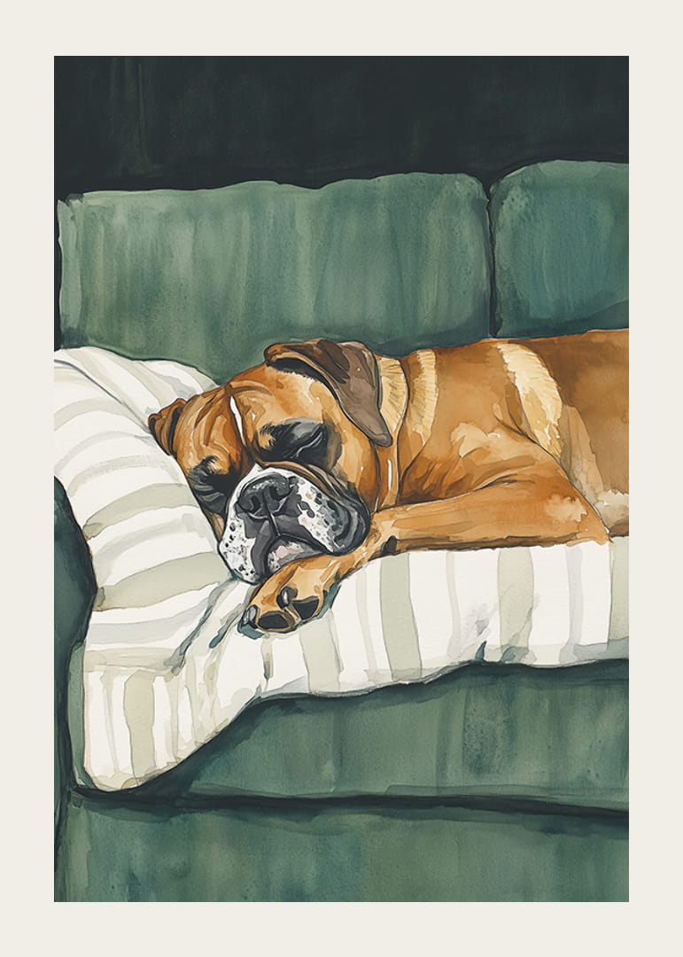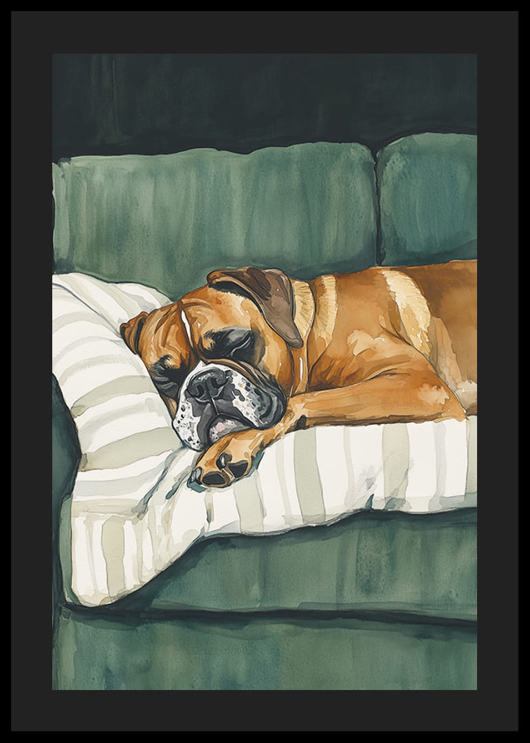 Acest poster fermecător arată un boxer adormit odihnindu-se confortabil pe o pernă cu dungi pe o canapea verde. Tonurile de culoare moale și pensulele detaliate creează o atmosferă liniștită și familiară, perfectă pentru a oferi casei tale o senzație de calm și căldură.