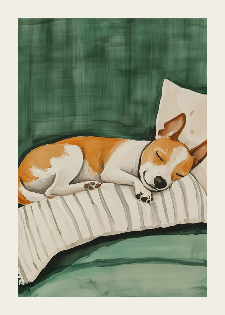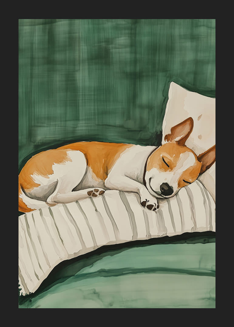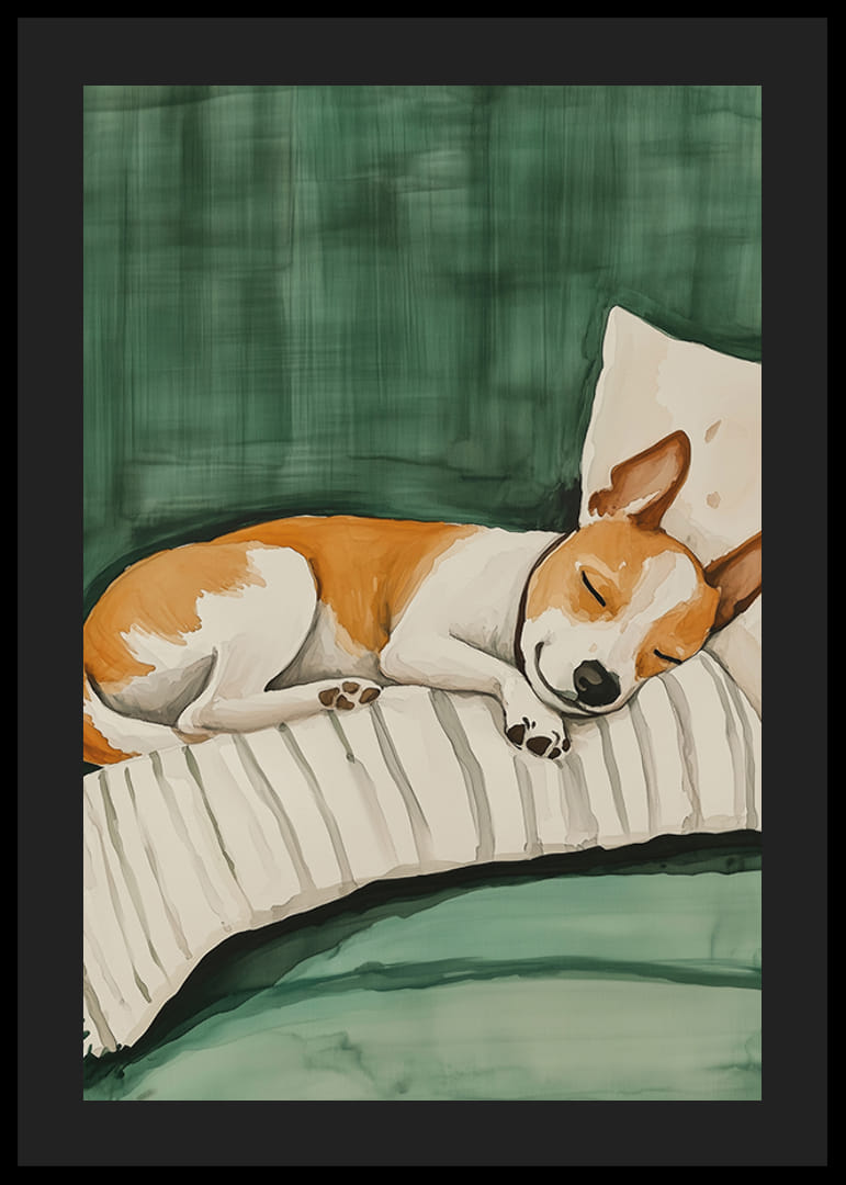 Acest poster fermecător arată un câine mic dormind liniștit pe o pernă cu dungi pe o canapea verde. Culorile moi și atmosfera relaxată creează o senzație caldă și primitoare, perfectă pentru a oferi casei tale o atmosferă calmă și familiară.
