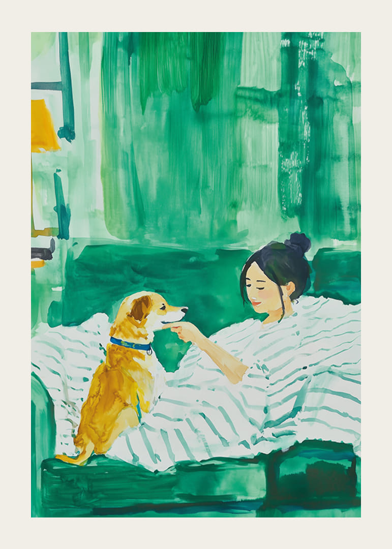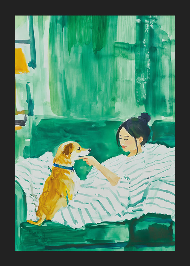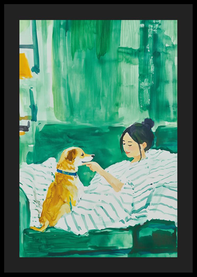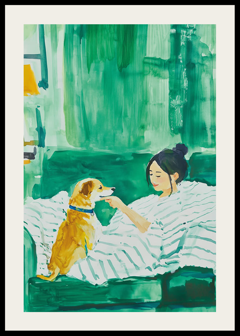 Experimentează armonia caldă a acestui afiș frumos, care întruchipează un moment de liniște între o femeie și câinele ei credincios. Cu un fundal verde luxuriant și pensule moi, imaginea invită la calm și intimitate.