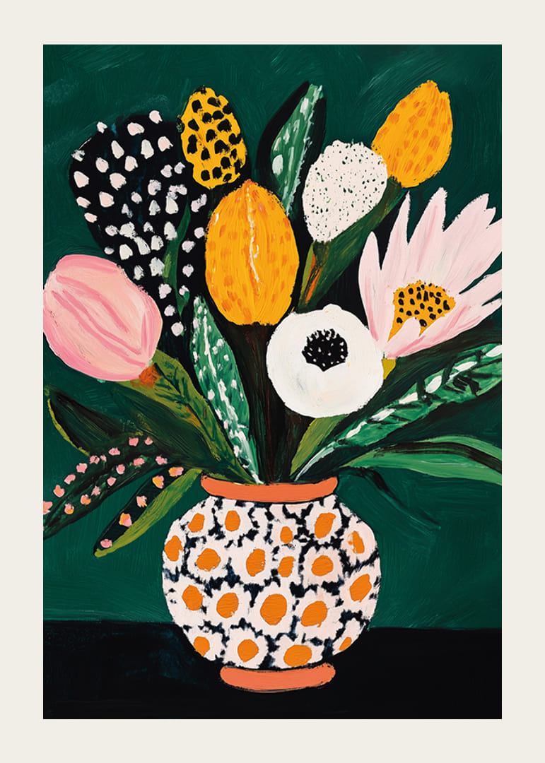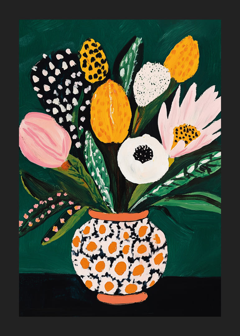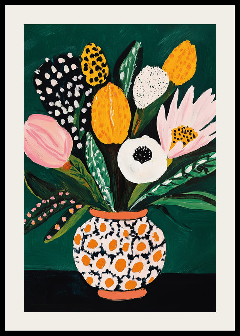 Îmbunătățiți-vă casa cu acest poster captivant care unește arta și natura într-o explozie de culoare și viață. Flori atractive în nuanțe de roz, galben și alb împodobesc o vază unică, cu buline.