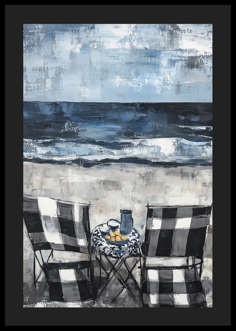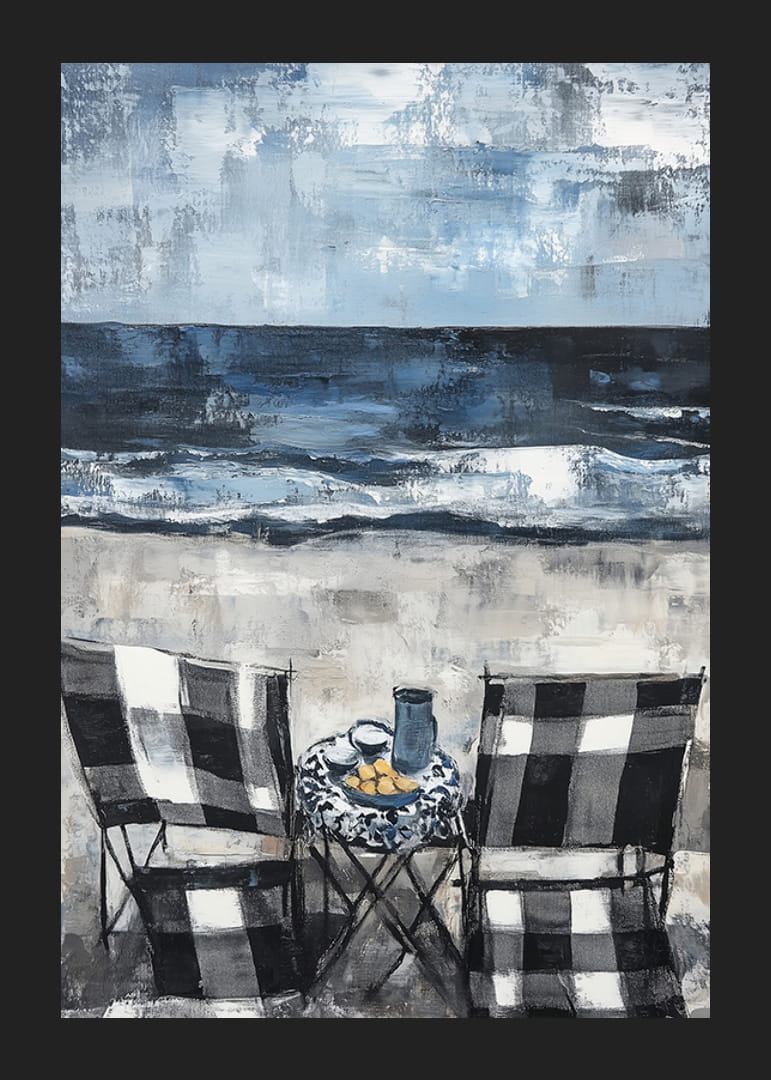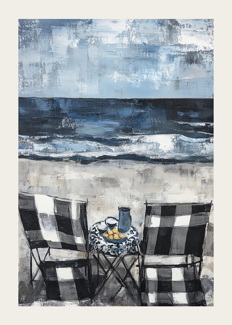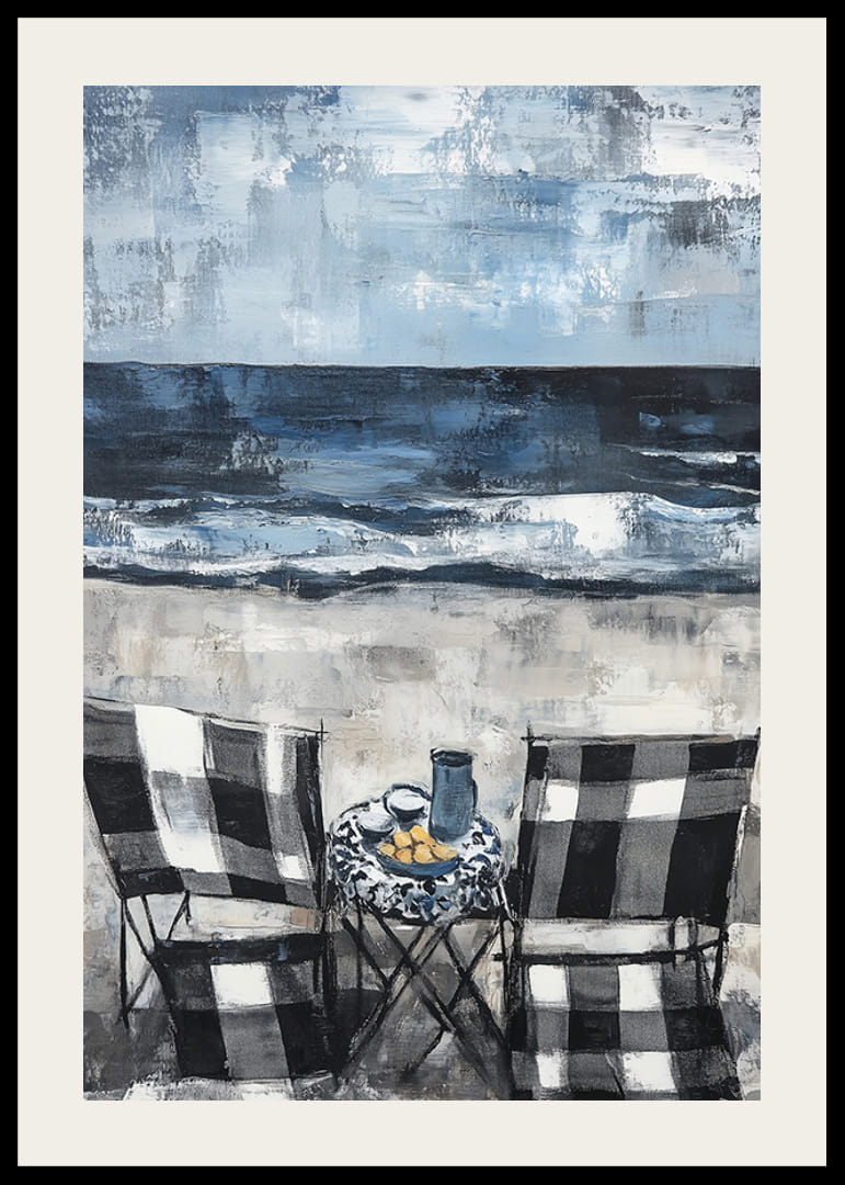 Acest poster surprinde un sentiment de liniște cu două scaune îndreptate spre un ocean dramatic. Nuanțele moi de albastru și gri creează o atmosferă liniștită, în timp ce mișcarea valurilor sporește senzația de libertate.